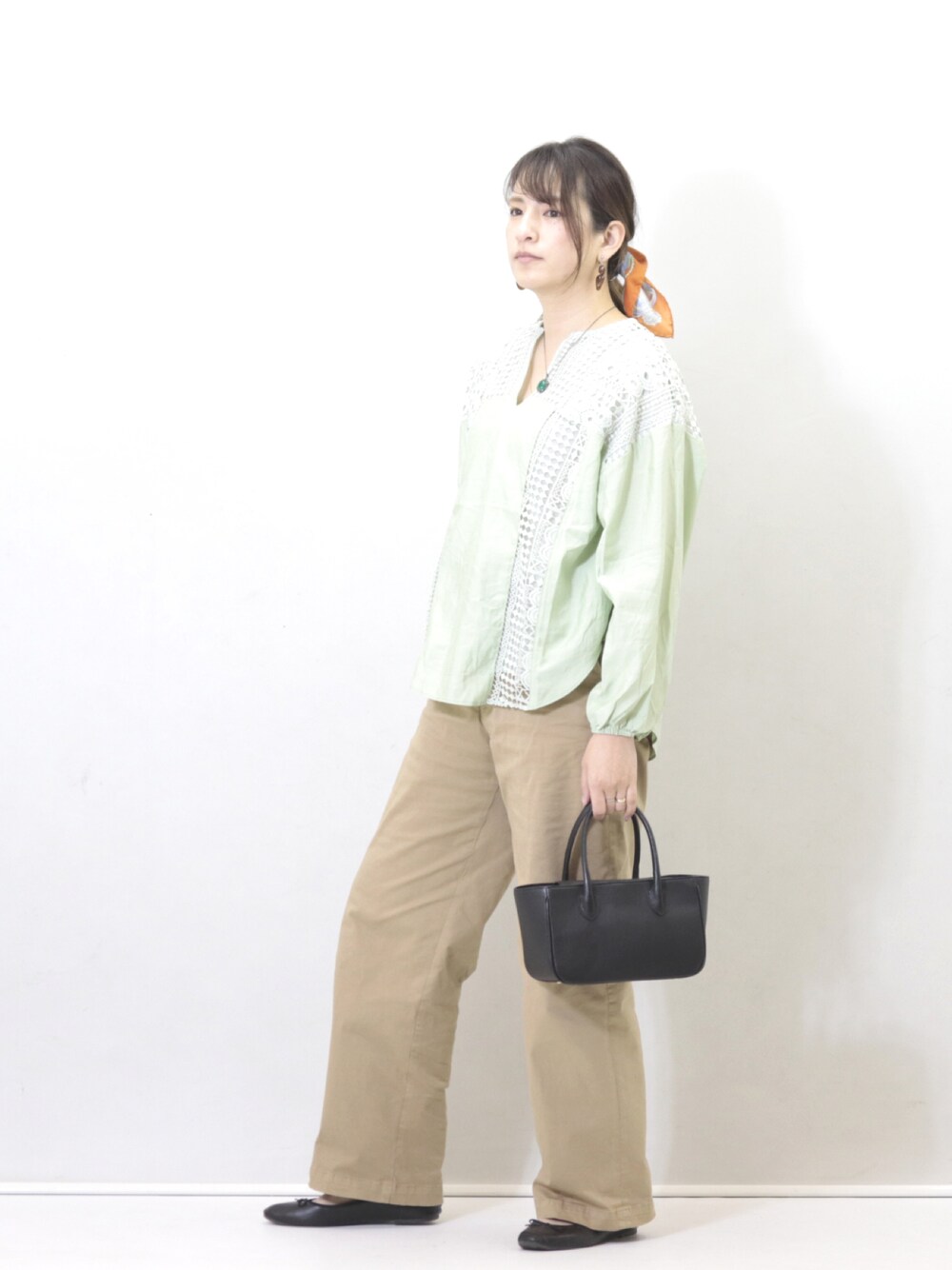 ケミカルレースのブラウス 手首がキュッと絞られていてスモックのような形。落ち感があるサラサラ素材は着痩せ効果有り🤲🏻💕 パンツはストレートトラウザーにしたら無骨さが出ていいと思うんですよ🤔💭