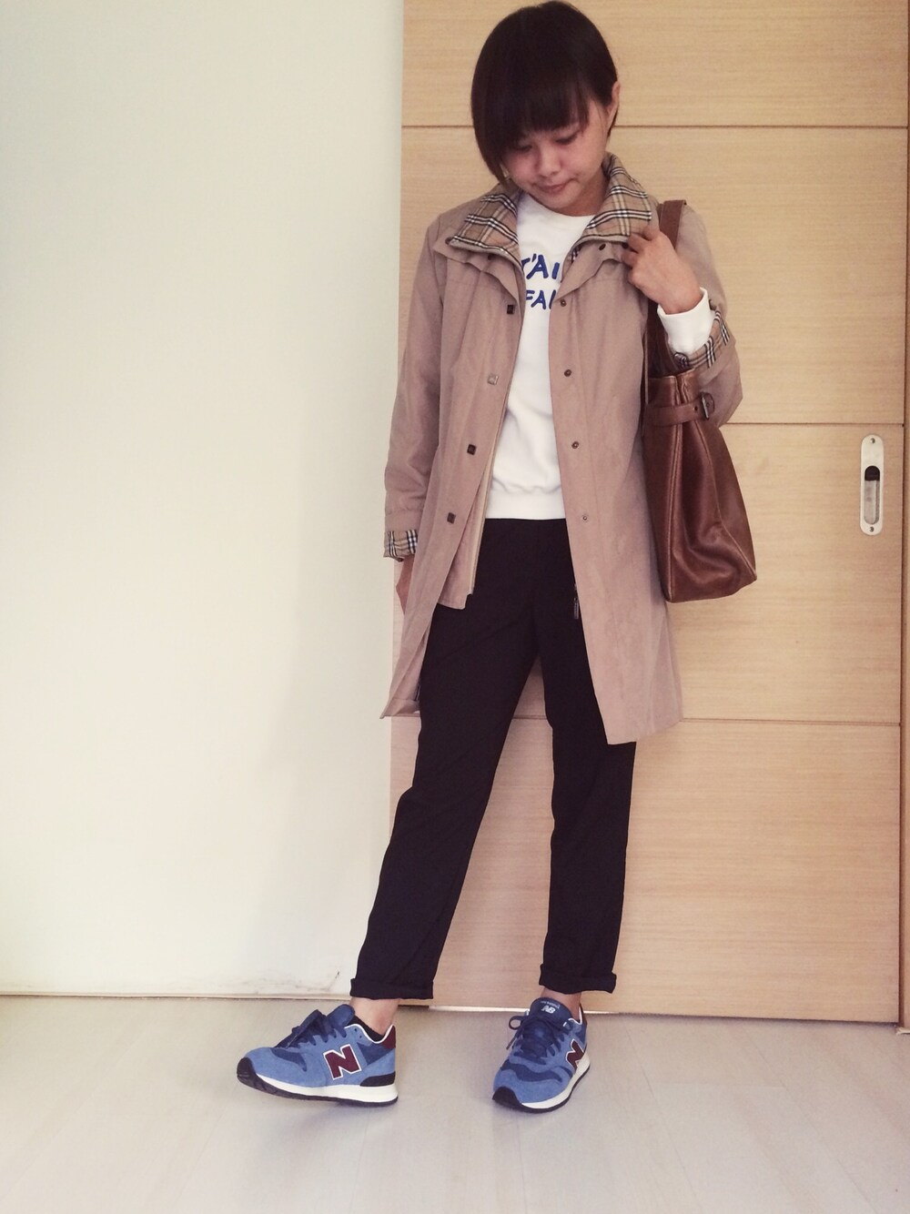 ブルー系のスニーカーを着用したレディースの秋コーディネートの1枚目の写真