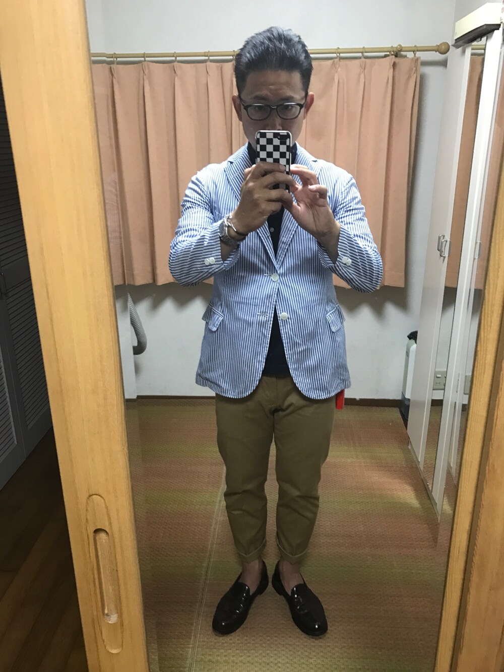 デイケアの仲間と食事会。 紺のポロシャツにストライプのシャツJK。 これで決まり!