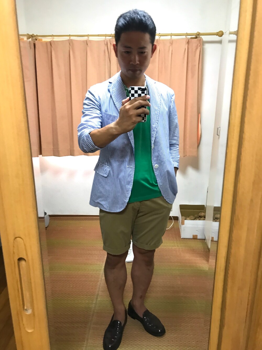 こんにちは☀️ いつもご覧頂きありがとうございます😊 今日の最後はいつもの大人カジュアル。 お気に入りのストライプのシャツJK、これホント使える。 汚いオヤジにはもってこい(笑) 今日は紺白のマリン風でなく緑のエイズTをさしてベージュのショーパンで合わせてみました😄 🥞ガード下のおしゃれカフェ。ハンモックに座ってのんびりパンケーキが食べられる。