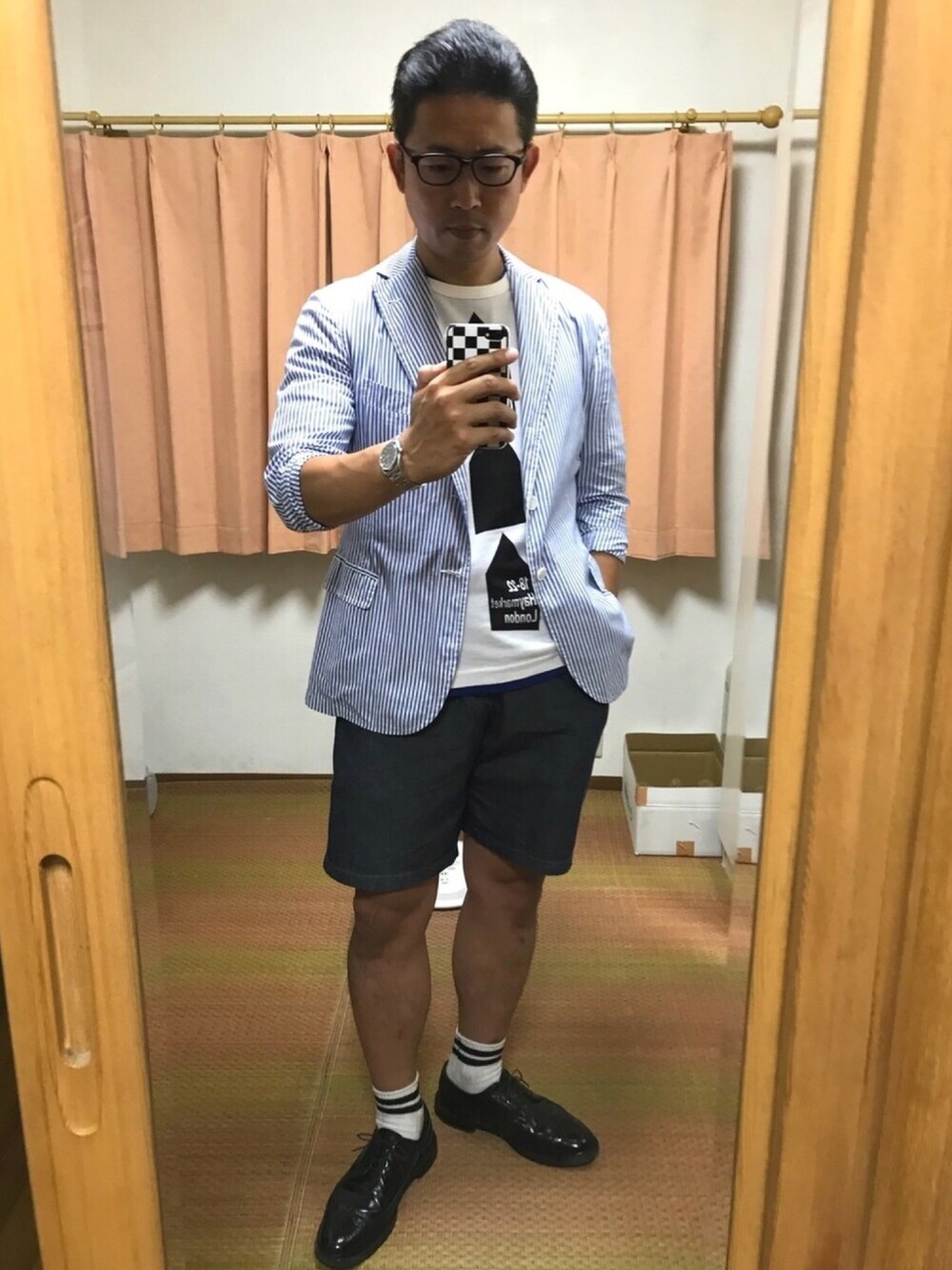 おはようございます☀ いつもご覧頂きありがとうございます😊 今日の2つ目はJK×ショーパンコーデ。 45歳のオヤジにとってさわやかコーデが永遠のテーマ。 ストライプJKに白Tで夏らしく。 シャツ生地で薄いからすごく便利。 今年一番使ったアイテムです😄 🔸川一は昭和通り沿いの路地を入った所にある老舗。場所は分かりづらいけど味は絶品です✨