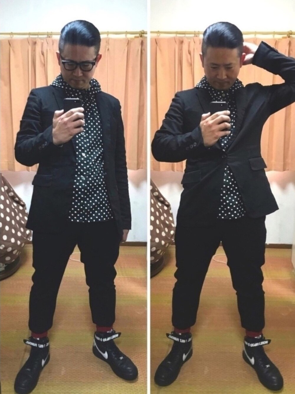 こんにちは✨ お昼休みのポチポチ投稿💦おたっしだよ🐷 今日のリアルお仕事コーデブギー🐷‼️ ギャルソンブラックコーデ‼️ ドットが好きすぎてまた着てしまった😱💦 いつもより多めにWaxベッタリ、タモリバリにビシッとオールバック😎キメてみました✨(笑) 今日は前回のペンギンスタイルのサルエルパンツに変えてクロップドパンツに👍 フォース1に赤ソックスもポイントブギよ🤗 ただ今★メルカリ断捨離SALE★開催中‼️ 午後もお仕事頑張ります🐷💦