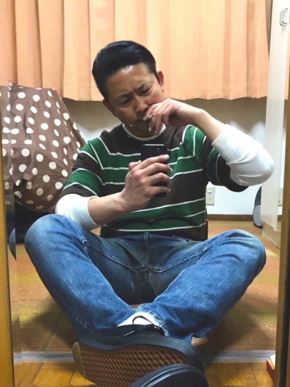 おはようございます☀️ いつもご覧頂きありがとうございます😊 片手スマホ自撮り研究会🐸📱ジドリスタのおたっしです🐷 いつもブギブギ言っとるけど、こう見えて色々考えることも多くてさ... 離れて暮らす娘達のこと、これからの仕事のことエトセトラ。 ということで、今日のコーデはカートの幸せのケロ色🐸トップスコーデです‼️久しぶりの地べた座りダバポ🐷🚬ブギ〰️‼️ あっ、てんさんのパクりだけどね😏(笑) これからも今の自分にできる事を精一杯頑張るブギよ💪🐷💦できれば楽しくね。 メルカリ大量出品中‼️本日SALE最終日ブギ‼️ 皆様にとって楽しくて幸せな一日でありますように✨ケロケロッ🐸💕