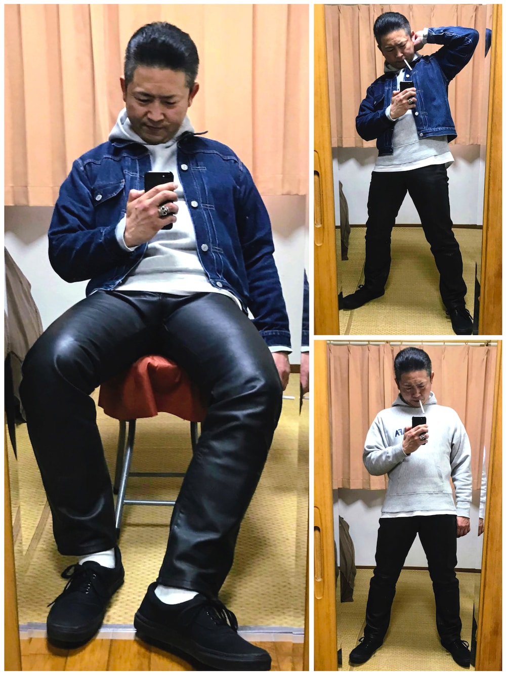 こんにちは☂️ お昼です🚬 今日も沢山の👍、お気に入り、フォロー、フォルダインありがとうございます😊💕 アメカジピチパツ💦レザーパンツコーデ第二弾です‼️ 今回はお気に入りのGジャンバレンシア1stで👍✨ 強引にねじ込みました‼️ おかげで前ジップ壊れてしまいました😱💦 リペア代高いので、紐付けてみました😏笑 以上です。