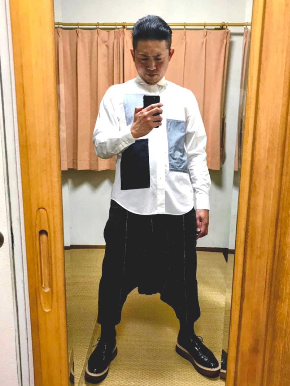 おたっし🐷のシャツ/ブラウス「🔸ガンリュウ パッチワークドレスシャツ(白)」を使ったコーディネート