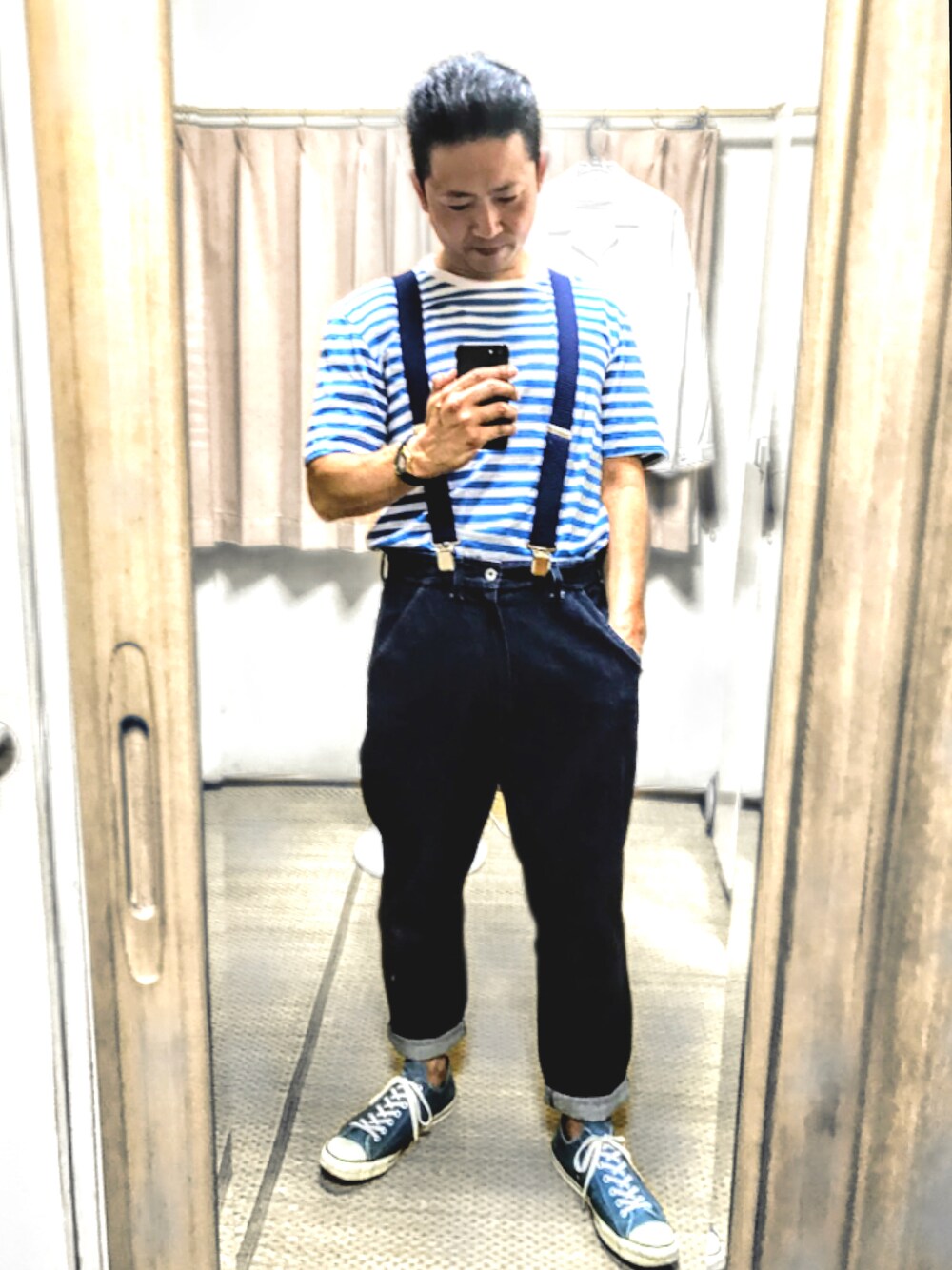 こんにちは✨ 最近黒ばっかだからやっぱブルーで爽やカニ🦀 しましま、ボーダーでニヤニヤね😏 極太ペインターにサスペンダーの僕の鉄板コーデです🤗♬ メルカリ★期間限定SALE★開催中‼️ 明日も皆様にとって楽しくて幸せな一日でありますように👋🐷💕