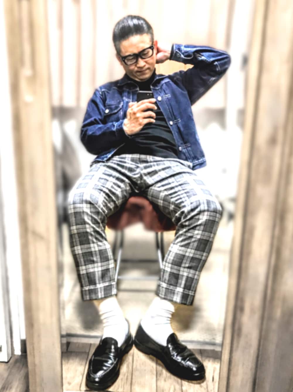 おはようございます☁️ いつもご覧頂きありがとうございます☁️ 白髪染めてみました。 程よくエイジングしたGジャンにチェックパンツってやっぱいいんだよねぇ🤔 ドレスシューズに白ソックスも好き💕 今日は履いてますよ😏 メルカリ★期間限定SALE★開催中✨ 今日も皆様にとって楽しくて幸せな一日でありますように🐷💕