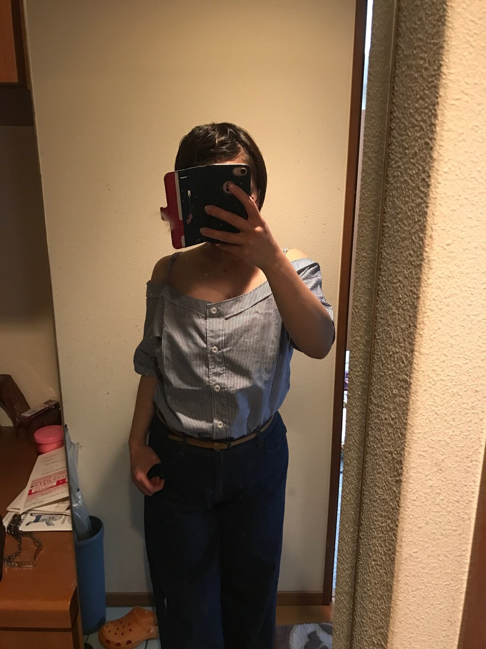 ポッチャリコーデで、肩出し(ストライプ)