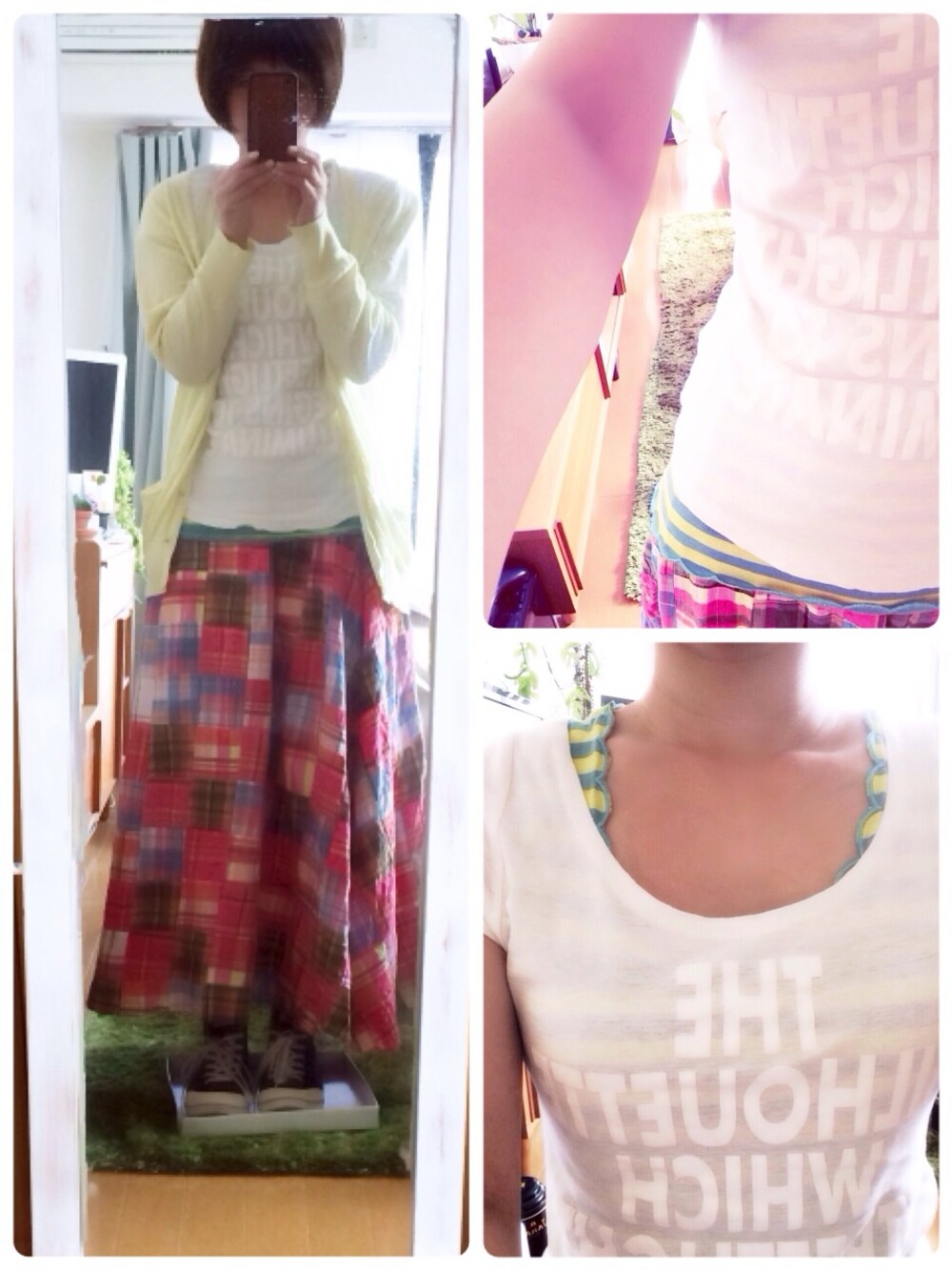 春らしい色で、友達とランチ♪ Tシャツから見えるタンクトップの色がポイント