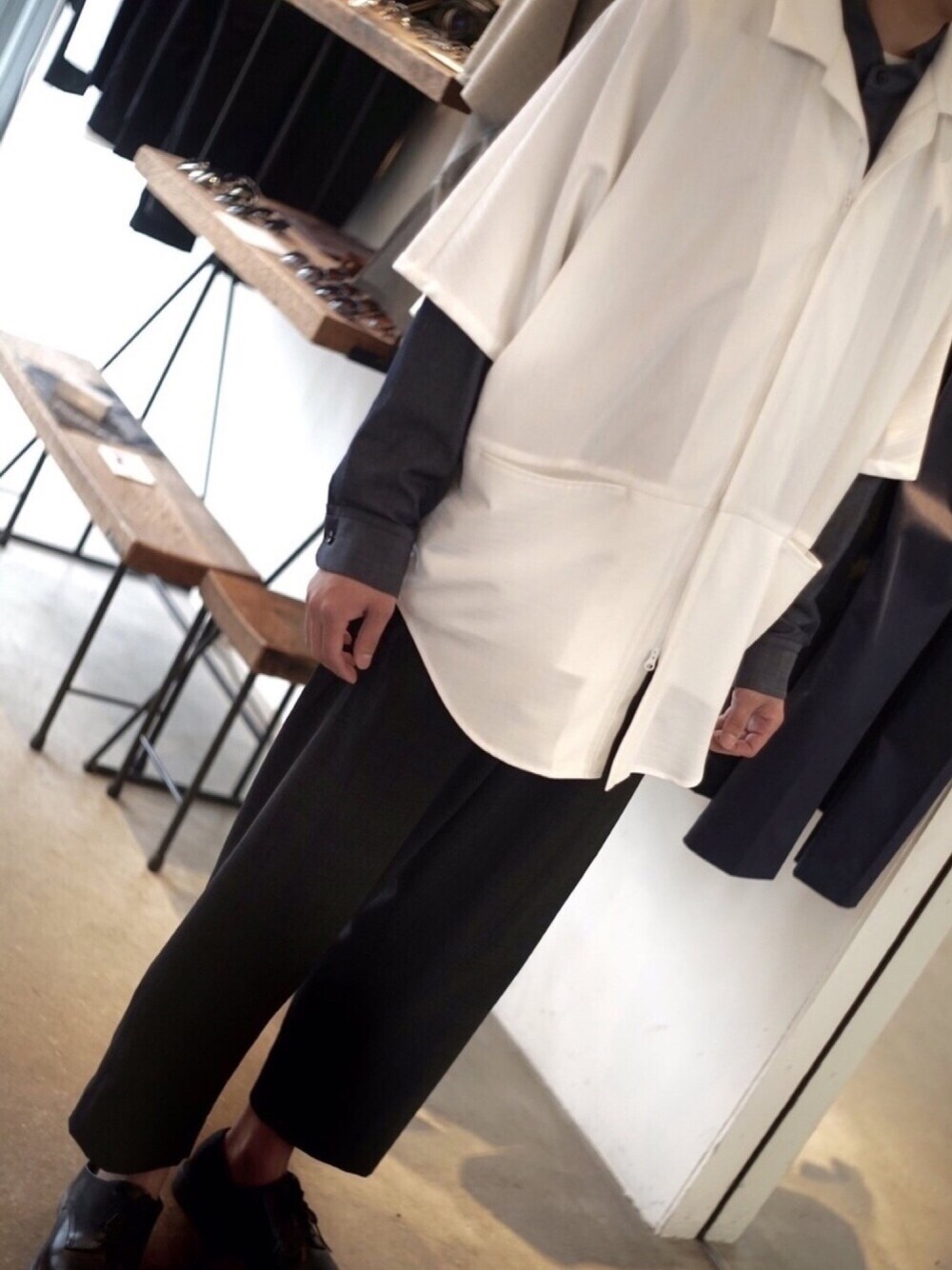 初投稿ー! ゆるっとしたシルエットが可愛い開襟シャツ! シルエットがいいワイドパンツで合わせて見ましたー まだ肌寒いのでシャツonシャツ! あまり見ないので新鮮ですー