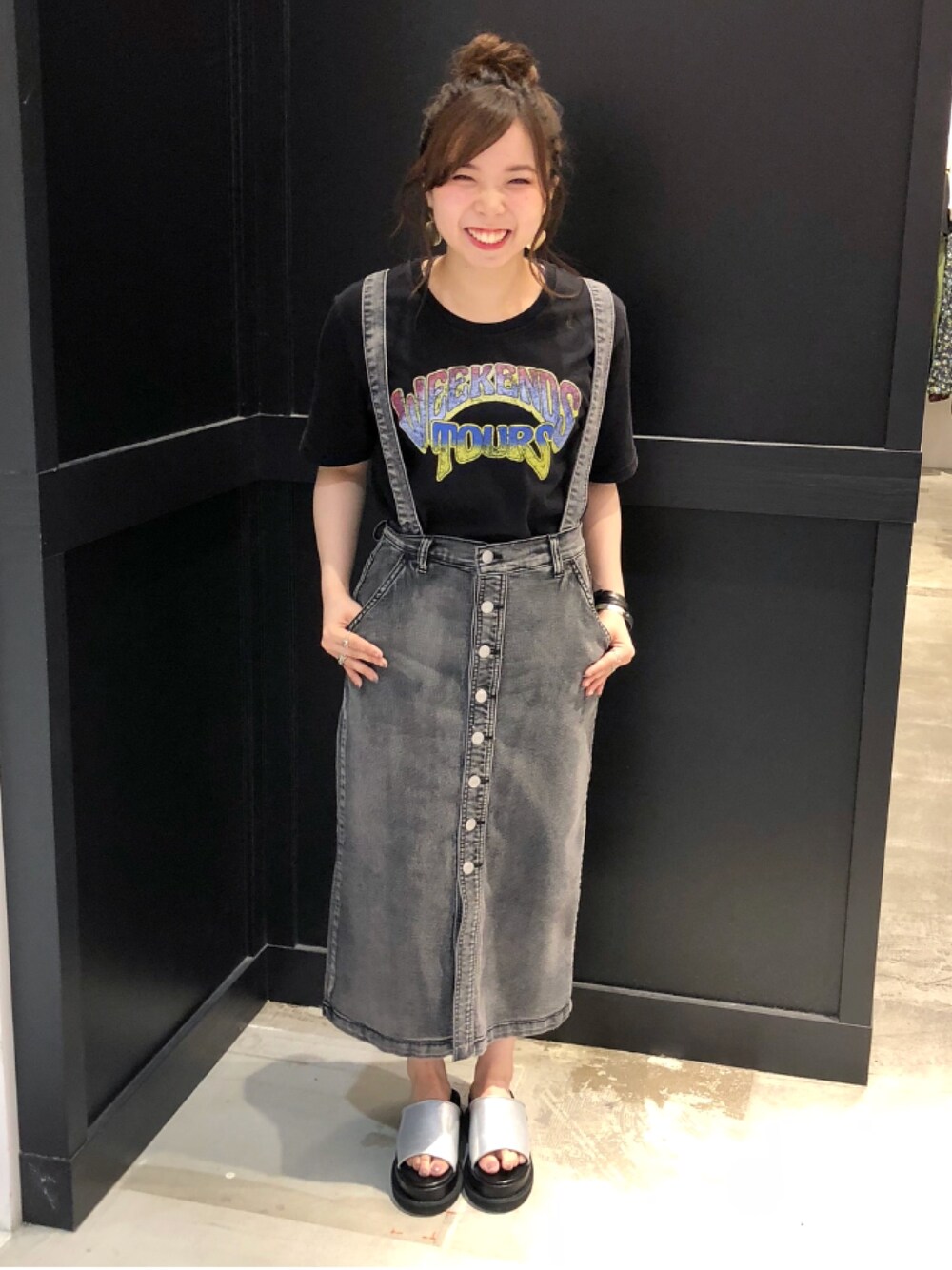 以前にも投稿しましたが、お気に入りのTシャツとスカートです😉💕 Tシャツは背中にも大きめのロゴが入っているのでバックスタイルも◎ 低身長さんにはスカートの肩紐が長いと思うので後ろでクロスするとぴったりだと思います🙆♀️