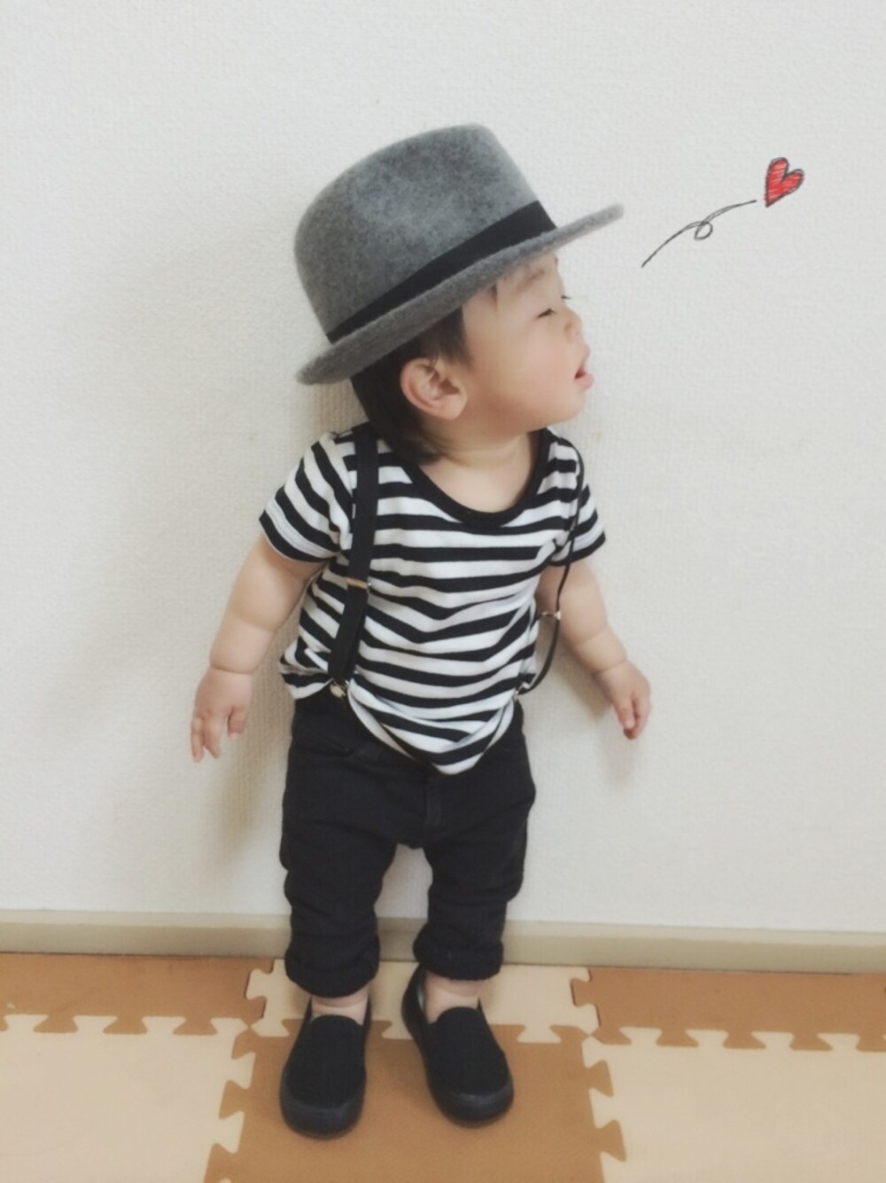 ブラック系のTシャツ/カットソーを着用したキッズの春コーディネートの1枚目の写真