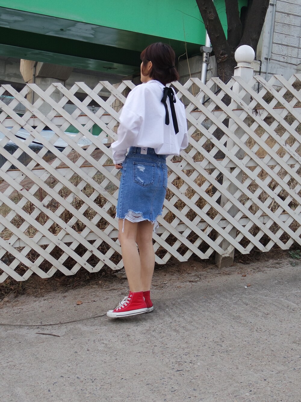 レッド系のスニーカーを着用したレディースの春コーディネートの1枚目の写真