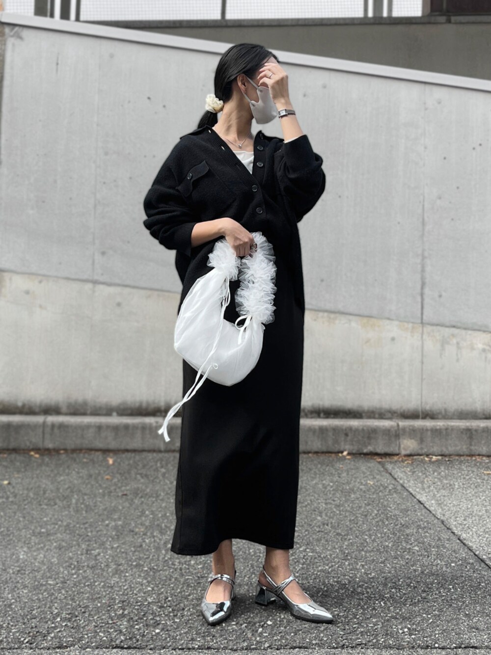 ブラックコーデの小物はフリルやシルバーを合わせてメリハリをつけるのが吉◎