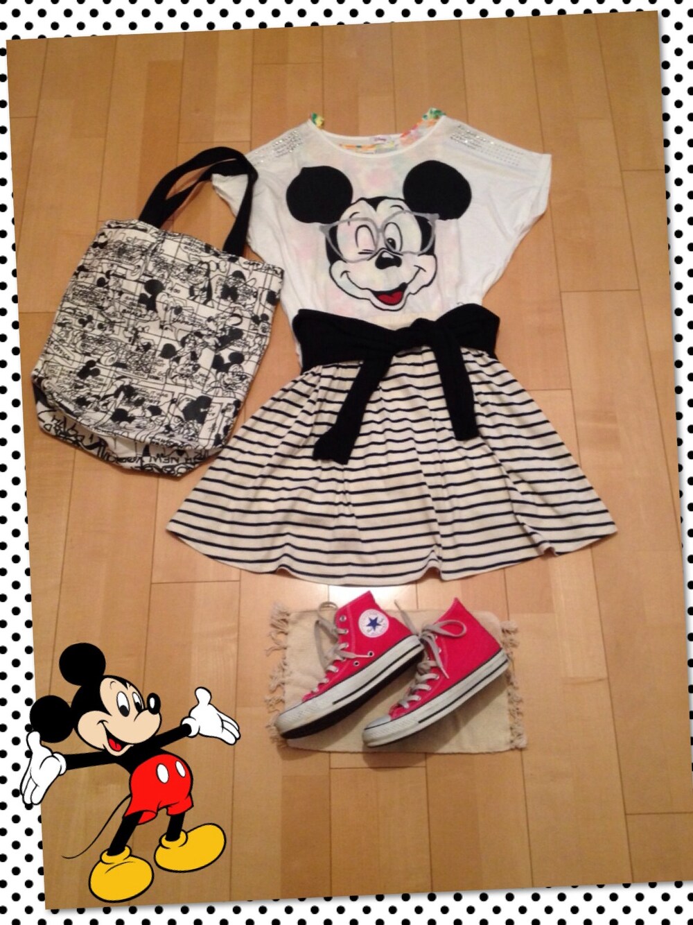 ☺︎トップス:ブランド不明 ☺︎スニーカー:コンバース ☺︎トートバッグ:フランフラン #disney