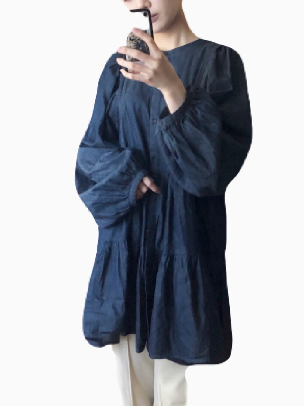 大学のあとアパレルバイトへ。 全身 #greenparkstopic デニムのティアードチュニック、151センチの私にはオーバーサイズだけどそれはそれで可愛いかな