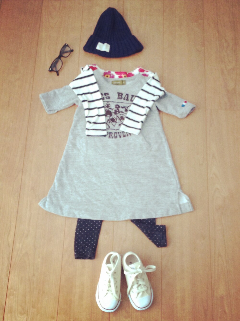 ニット帽:グローバルワーク ワンピース:ブランド不明 ボーダートップス:韓国 レギンス:無印良品 スニーカー:コンバース