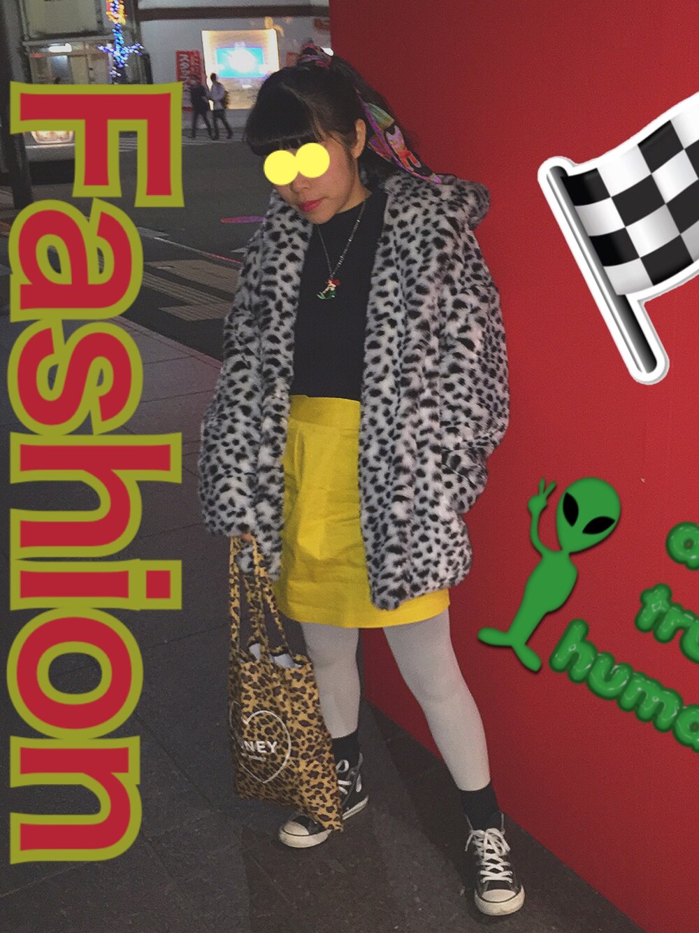 イルミネーション見に行ってきました~~!頭にはスカーフをぐるぐる巻きにして、超絶簡単ヘアアレンジ(笑) 差し色に黄色のスカート、目立つ為にダルメシアンのファーコートを。。!