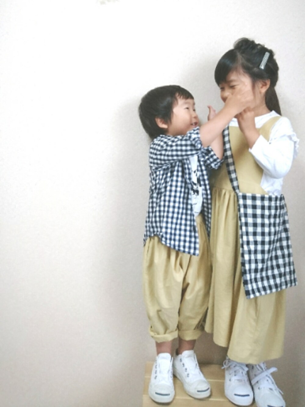 チームバレーボール 初参加♥️ ちょうど撮り溜めに娘セレクトのコーデがあったので☺️ このエプロンワンピは親子共にお気に入りです❣️ 色柄違いも作りたいな〜💞 そして息子もこのパンツはいつも穿いてます☺️ 「ママが作ってくれたやつ!!」って逢う人逢う人に言いふらす😂 いつまで喜んで着てくれるかな😳 見ていただきありがとうございます♥️
