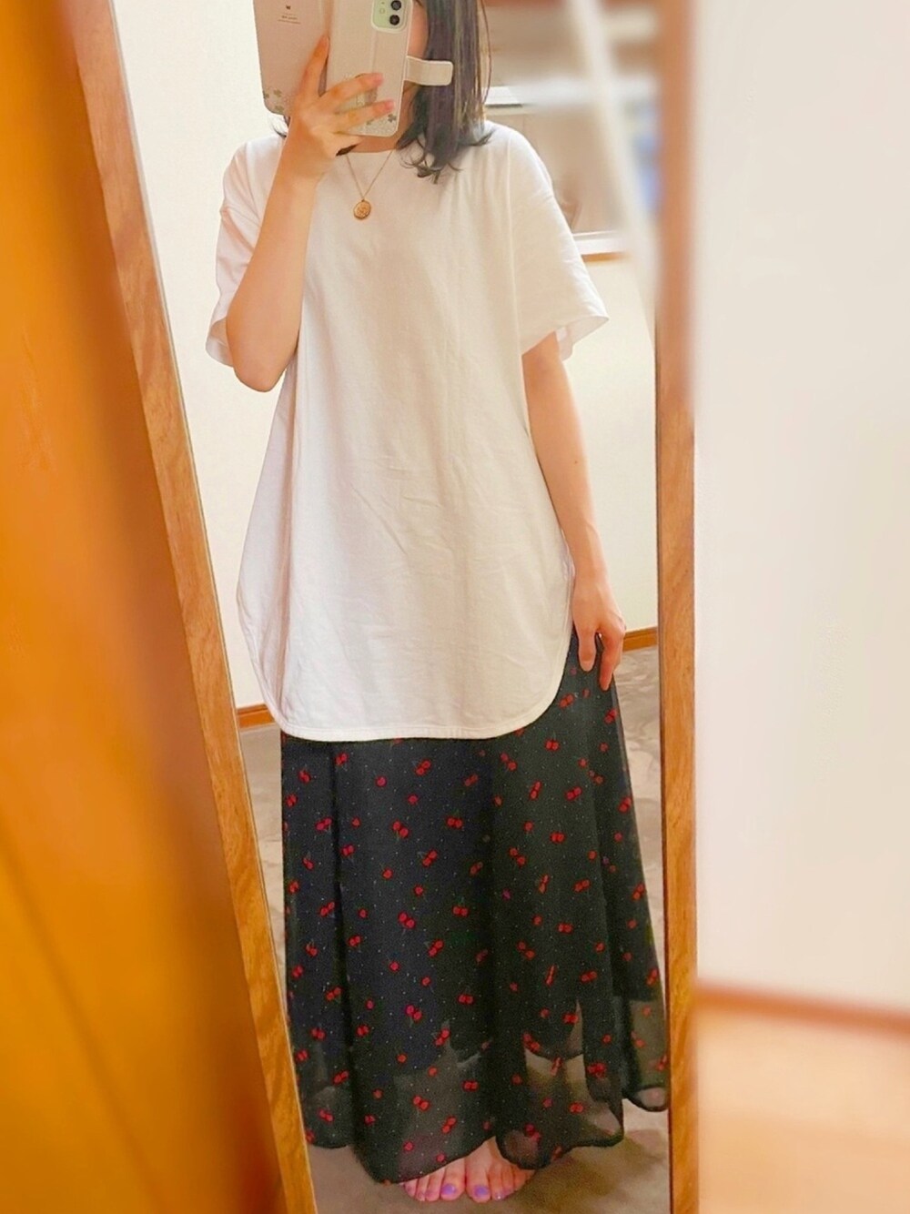 ゆるTコーデ🍒 今日はTシャツをインせずにゆるく着てみました❁︎ Availで購入したスカートのさくらんぼ柄が 可愛くてお気に入りです♪ 存在感のあるネックレスを付けて 目線が上に行くようにしました✲*゚ ┈┈┈┈┈┈┈┈┈┈ 今日も見ていただきありがとうございます🌼 いいね・フォルダinなど とっても嬉しいです´ω`*