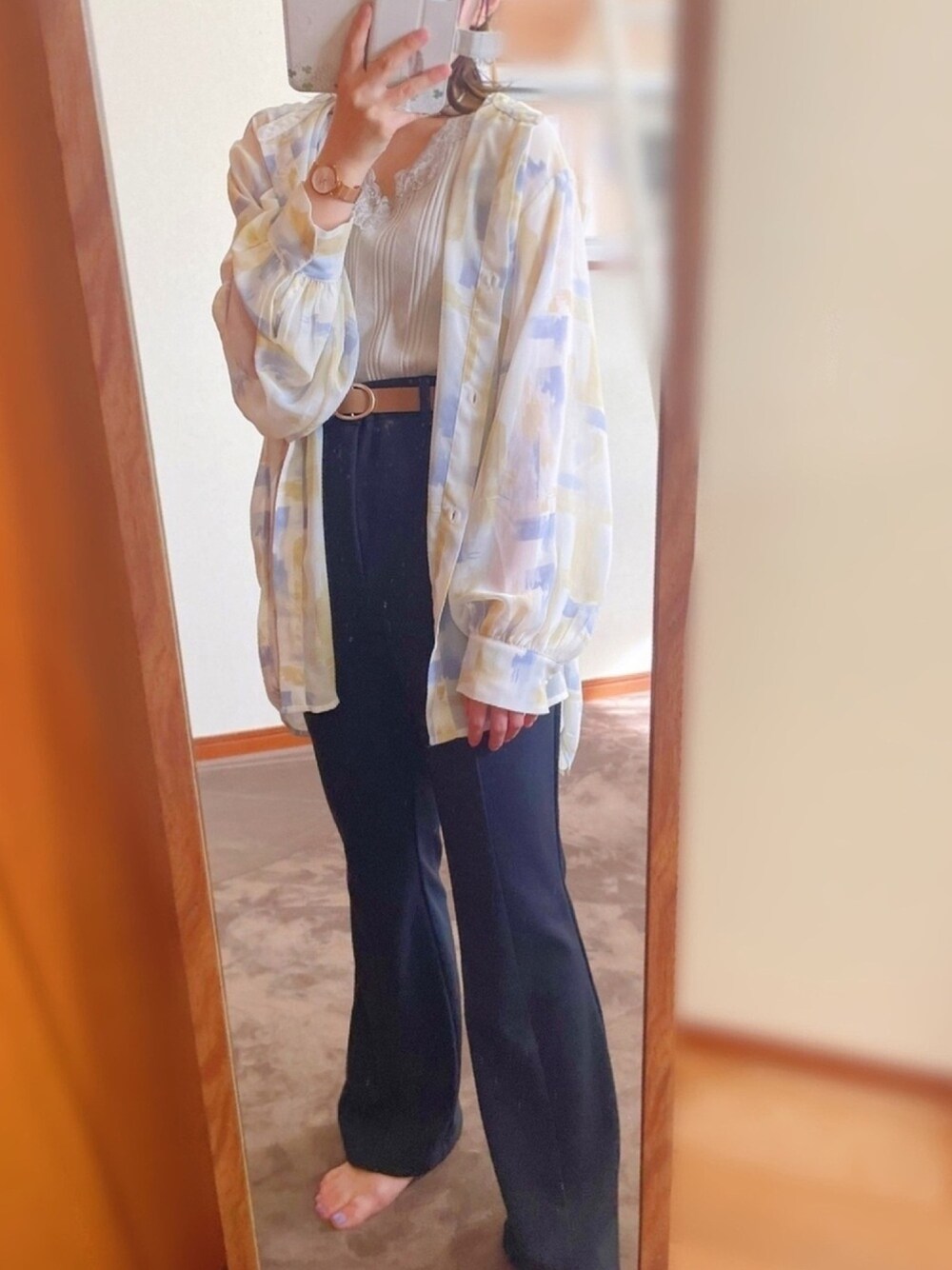 柄シアーシャツコーデ🐠 インナーを肌に馴染むライトブラウンにして シャツがより目立つようにしました❁︎ アクセサリーはゴールドでまとめてます♪ ┈┈┈┈┈┈┈┈┈┈ 今日も見ていただきありがとうございます🌼 いいね・フォローなど とっても嬉しいです´ω`*