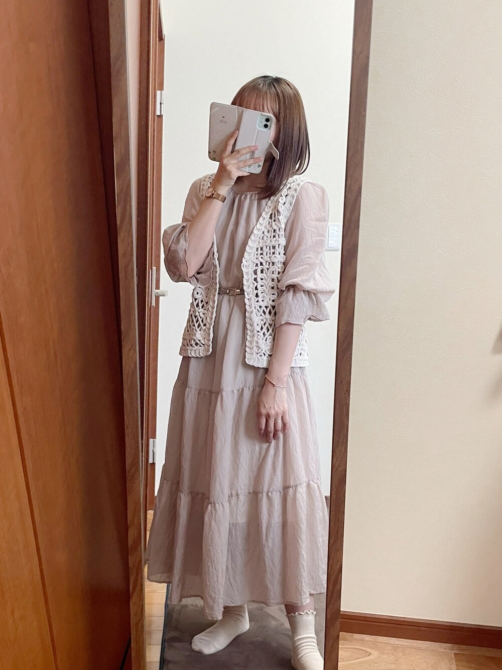 ベージュコーデ🐇 シンプルなワンピにビスチェを合わせました❁︎ 骨格ウェーブはウエストマーク最強です🫶🏻 ┈┈┈┈┈┈┈┈┈┈ 今日も見ていただきありがとうございます🌼 maroru✲*゚