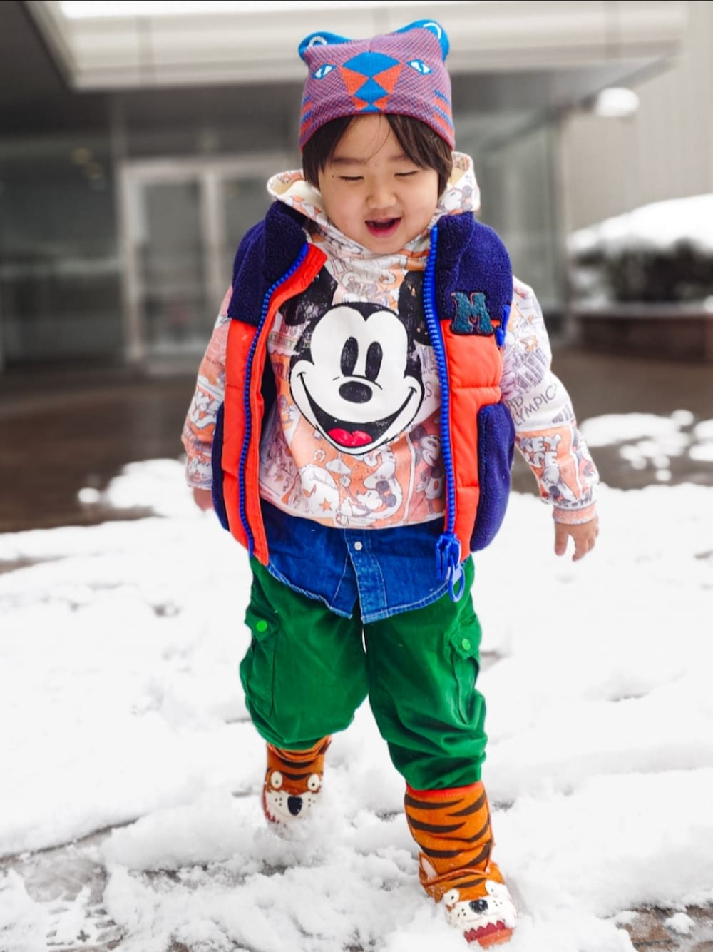 寒い日の屋外遊び〜屋内想定 半分は本人が選んだアイテムを 残りの半分でファッションとしてまとめたスタイリング トップス、帽子、ブーツは本人選択 これを面白さを削らずに、無難に落とさずに成立させるために ベスト、シャツ、パンツは親が選んだ合作