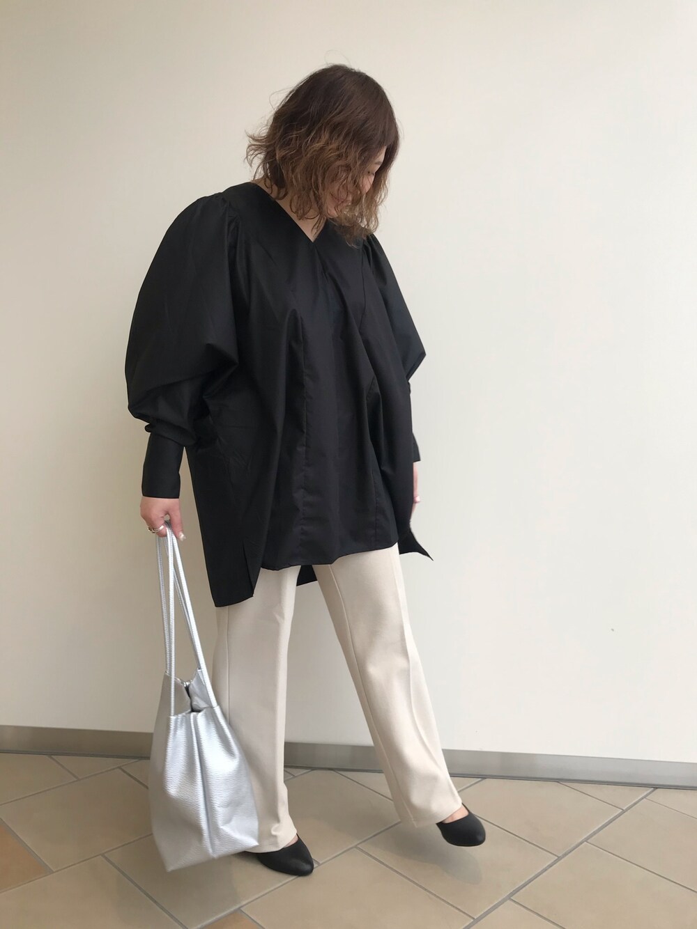 袖にボリュームがあるデザイン性の高いブラウス‼︎ 薄いベージュのパンツと合わせてモノトーンのコーディネートです‼︎ シルバーのバッグも大人な印象になります‼︎