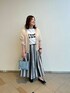夏物アイテムを使いつつ秋口まで着れるカーディガンを合わせたコーディネートです☺️ 今期大人気のロゴTEEは小さすぎず大きすぎない絶妙なサイズ感でどんなスタイルにも合わせやすいです😊 スカートもトップス次第で長く使える素材感です⭐︎ カーディガンはリブ部分がラメでキラキラしているのでキレイめなコーディネートにもおすすめです🤗