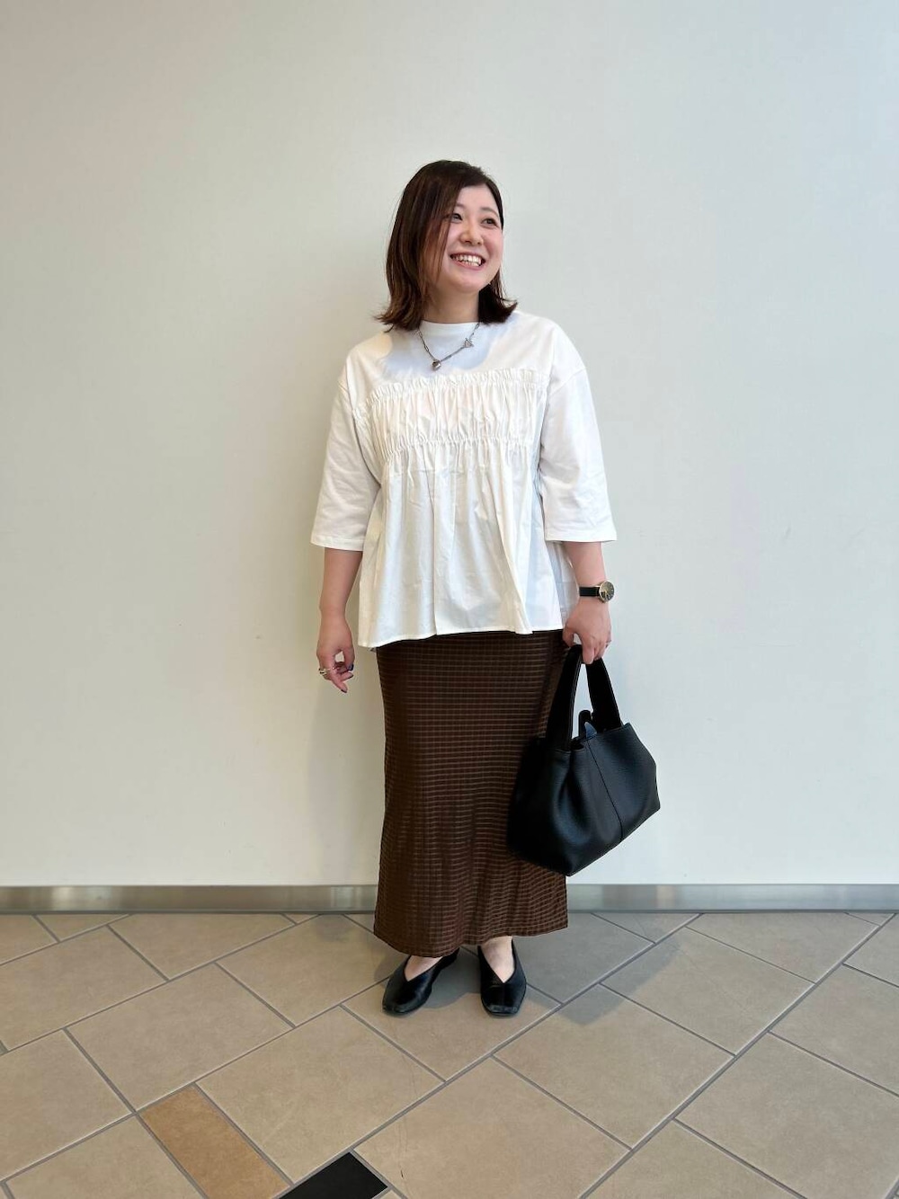 ゆったりとしたギャザーTシャツにタイトスカートを合わせたシンプルコーデです☺️ スカートは伸縮性があってタイトスカートでもノンストレスでした👏👏 タイトスカートだと気になるお腹周りやお尻周りも長さのあるトップスを合わせることでカバーできますよ😊