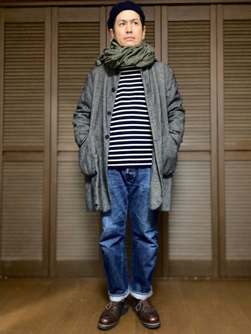 ヘリンボーンツイードのコートにニットとデニムパンツ。足元は革靴。 ストールはフランス軍。薄手ですが長いのでぐるぐる巻きにすると意外と暖かいです。 極めてシンプル且つ普遍的な着こなしですが、これからも変わらず続けていくであろうコーディネートのひとつです。