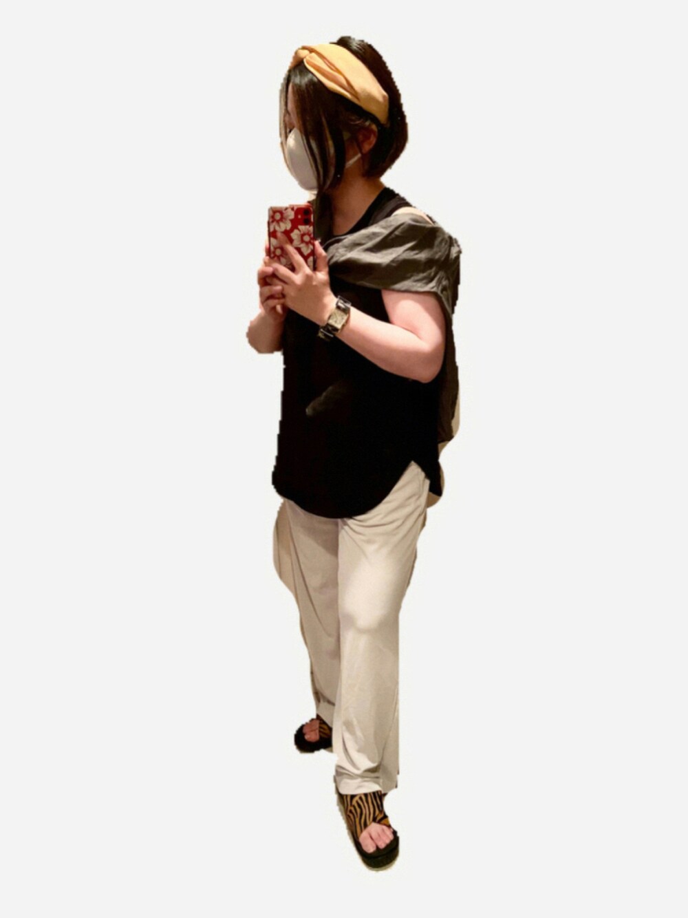 🟡⚫️⚪️🟤 アニマル柄に初挑戦✨ 🩴→アニマル柄🐯でワンポイント。 🎽→肩がキレイに見える!丈がちょうど良い! 👚→カーキのリネンシャツを肩掛け 👖→ライトグレー。使いやすい色! 🎀→素材も夏仕様で付けていても暑くない。