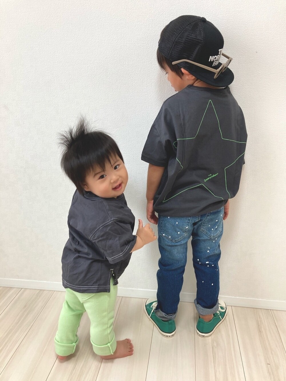 いつも♡、+、follow、📁in、ありがとうございます🙇♀️ とってもうれしいです😊✨ ぼくも〜な乱入者versionを大窓に🤗 とにかくはいってくる🤣 GROOVYのトップス☆💚 これまたもっとゆったりでもよかったか🤔 こぅなったら… SHINのをKOUに KOUのをKIYOに まわそっか😏👍 今日もかわいい♡ KOU→105cm.16kg