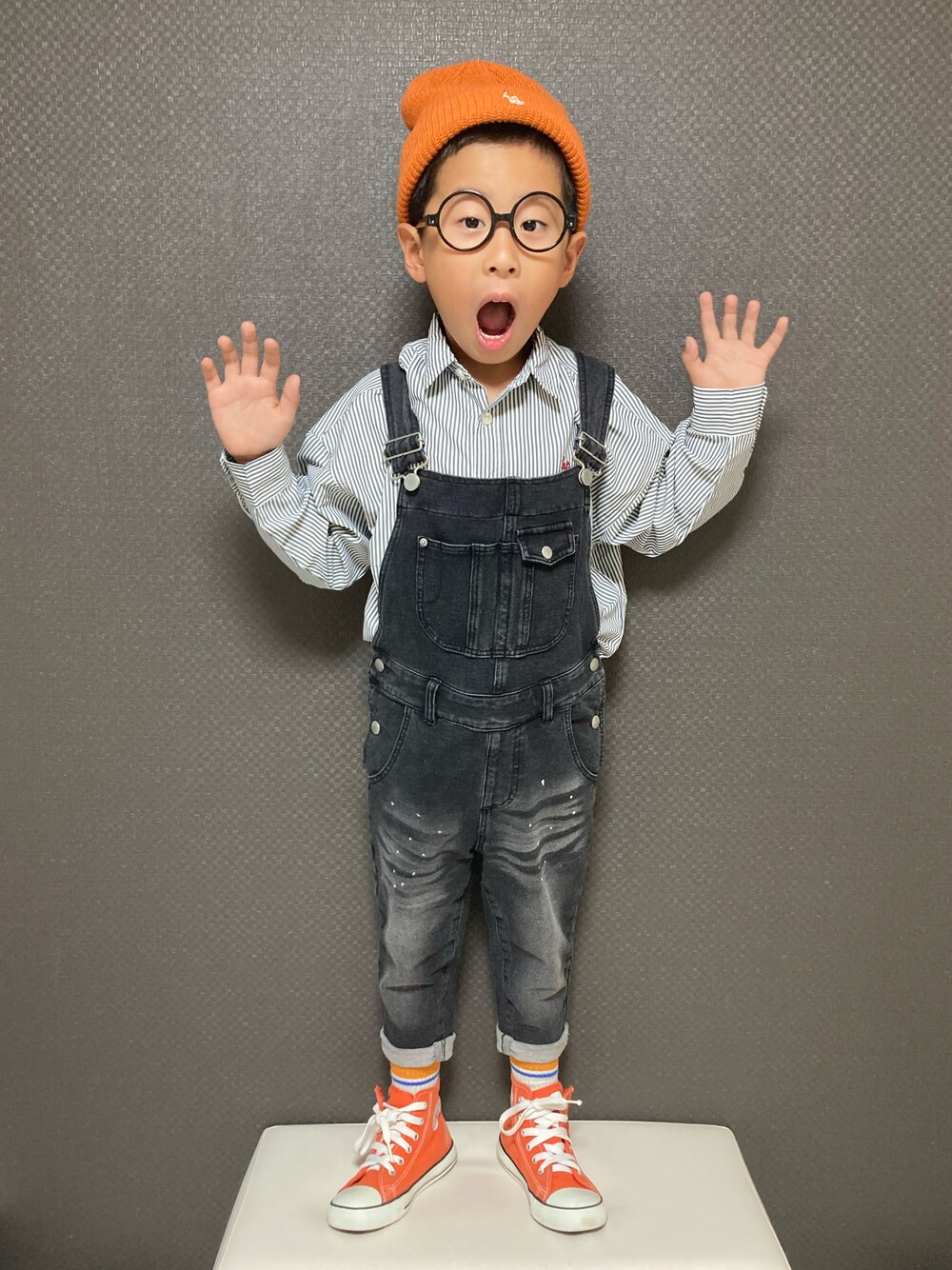 おはようございます.。oO♡ おばけポーズ🧟♂️👻🎃 オレンジ小物をメインにしたサロペコーデ🎃🥕🍊🧡🎃🥕🍊🧡🎃🥕🍊🧡 ダメージデニム×きちんとシャツ🖤♥️ このギャップがくせになる🤭✨ 見ていただきありがとうございます.。.:*☆ 今日もかわいい♡ KOU→115㎝.20kg