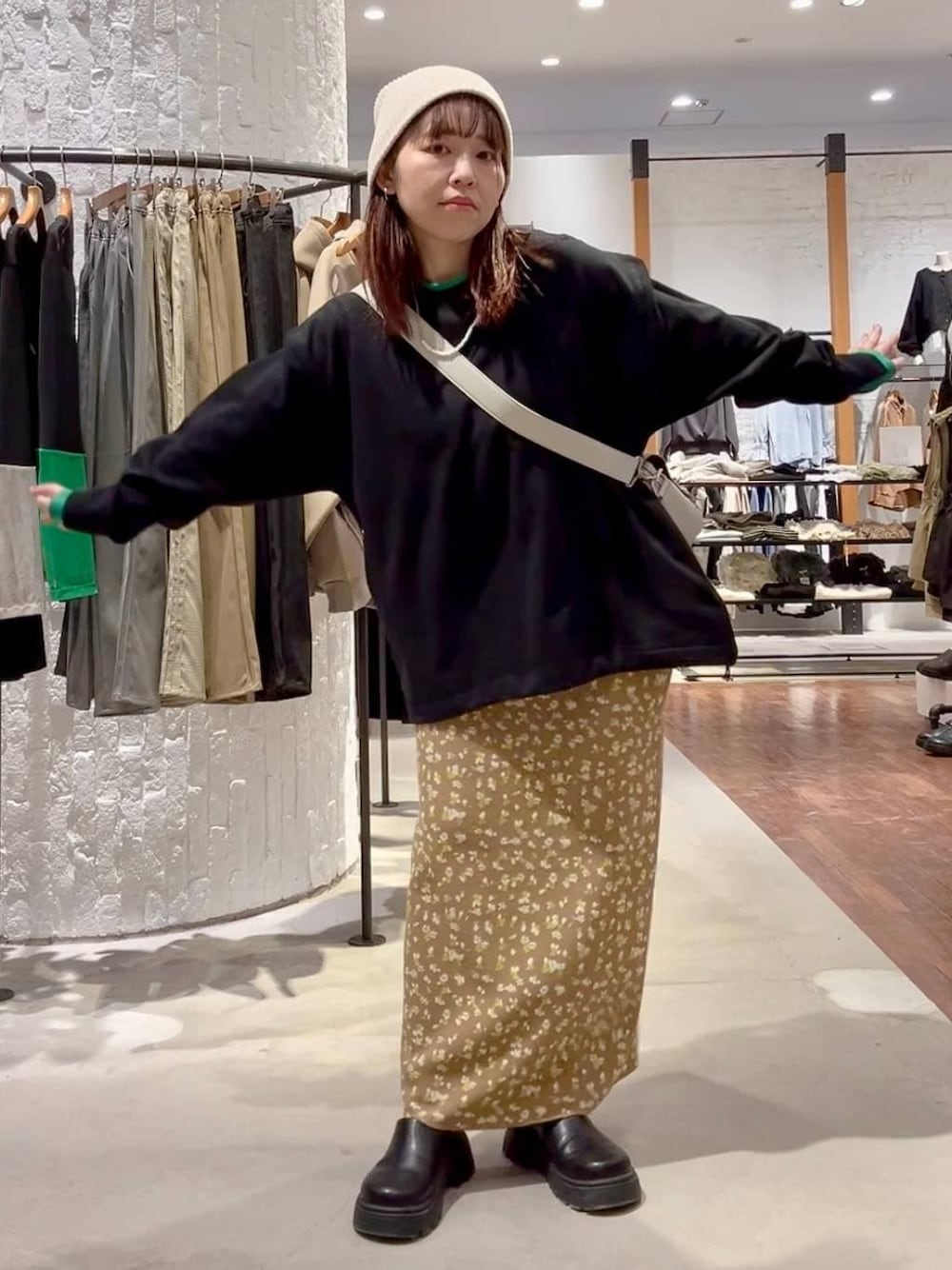 ⭐各アイテムのおすすめポイント  ̄ ̄ ̄ ̄ ̄ ̄ ̄ ̄ ̄ ̄ ̄ ̄ ̄ ̄ ̄ ̄ ̄ 【トップス】 ゆったり。着丈サイズ調整可能。 着るだけでオシャレ見えするトップス😊 首元と袖口の配色がポイントになっていてスタイリングのアクセントになります✨ ポイントカラーがチラリっと見える感じなので派手過ぎずにスタイリングもしやすいです👌 裾がドロストできて絞る事で着丈のシルエットを変化させられて飽きずに着こなしできます👍 お尻周りが気になるタイトスカート合わせには…ドロストを伸ばして合わせるとバランスよく体型カバーできるサイズ感で着用できます❣️ 【ボトムス】 ゆったり。 今期も出ました!春夏版のニットナロースカートの柄Ver.😊 今回は花柄🌸 夏にも履けるようにさらりとした生地で表面感がつるんとした加工感で全体のバランス良くすっきり見せてくれます👌 無地も定番だけど今年はコーデポイントのアクセントに柄ものもおすすめ❣️ Instagram にもスタイリング載せています❣️ ご覧下さい🙇♀️