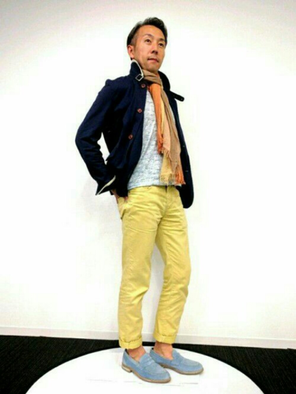コンサルティング部 K.Tさん インナーからシューズまで全体的に明るめにしつつ、アースカラーのストールと濃いめのジャケットでトーンダウンしてまとめました。 ストールカラーとパンツカラーの相性も一応意識しています(笑)