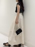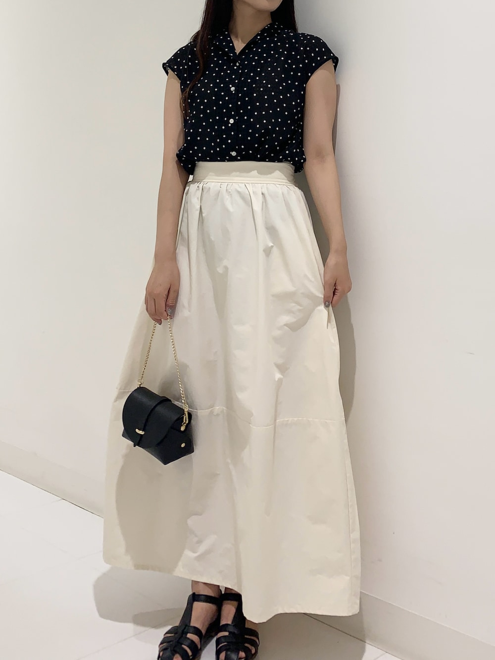 <『MADE IN JAPAN』 ドットプリントオープンカラーシャツ> しゃり感のある薄手のシャツは軽い着心地でこの季節にぴったりです! サイズは程よくゆとりがあると感じました。今回はきれいめカジュアルなのでインして着用しています◎ 前のボタンは全て開きますので羽織としてもカジュアルに合わせられそうです!(画像最後の方で開けている画像ございます) <コクーンマキシスカート> こちらのスカートはトップスをインしなくてもカジュアルに着こなせるので良いですが、よりメリハリやスタイルアップに着こなしたい場合はインしていただくのがおすすめです! 比較的薄手の生地で裏地がないためOFFはやや透けますので私はペチコートを合せようと思います◎ (今回はペチコートを着用していないですが下着が薄めの色でしたのでインしたトップスの黒の部分のみうっすら透けています) <レザーミニショルダーバッグ> 小ぶりですが必要最低限はいるバッグかと思います◎ 私は三つ折り財布、リップ、iPhoneを入れてみましたが余裕ではいりました。 (各アイテムのサイズにもよりますので、商品ページのサイズ表とお手持ちのアイテムのサイズを照らし合わせて頂けたらと思います) <『MADE IN JAPAN』グルカサンダル> 私は履いた際に重たいと感じませんでした! 普段24.5㎝〜25㎝を履いている私は38のサイズが素足でジャストサイズでした。 靴下を合わせると厚手の場合は窮屈に感じるかなと思います。