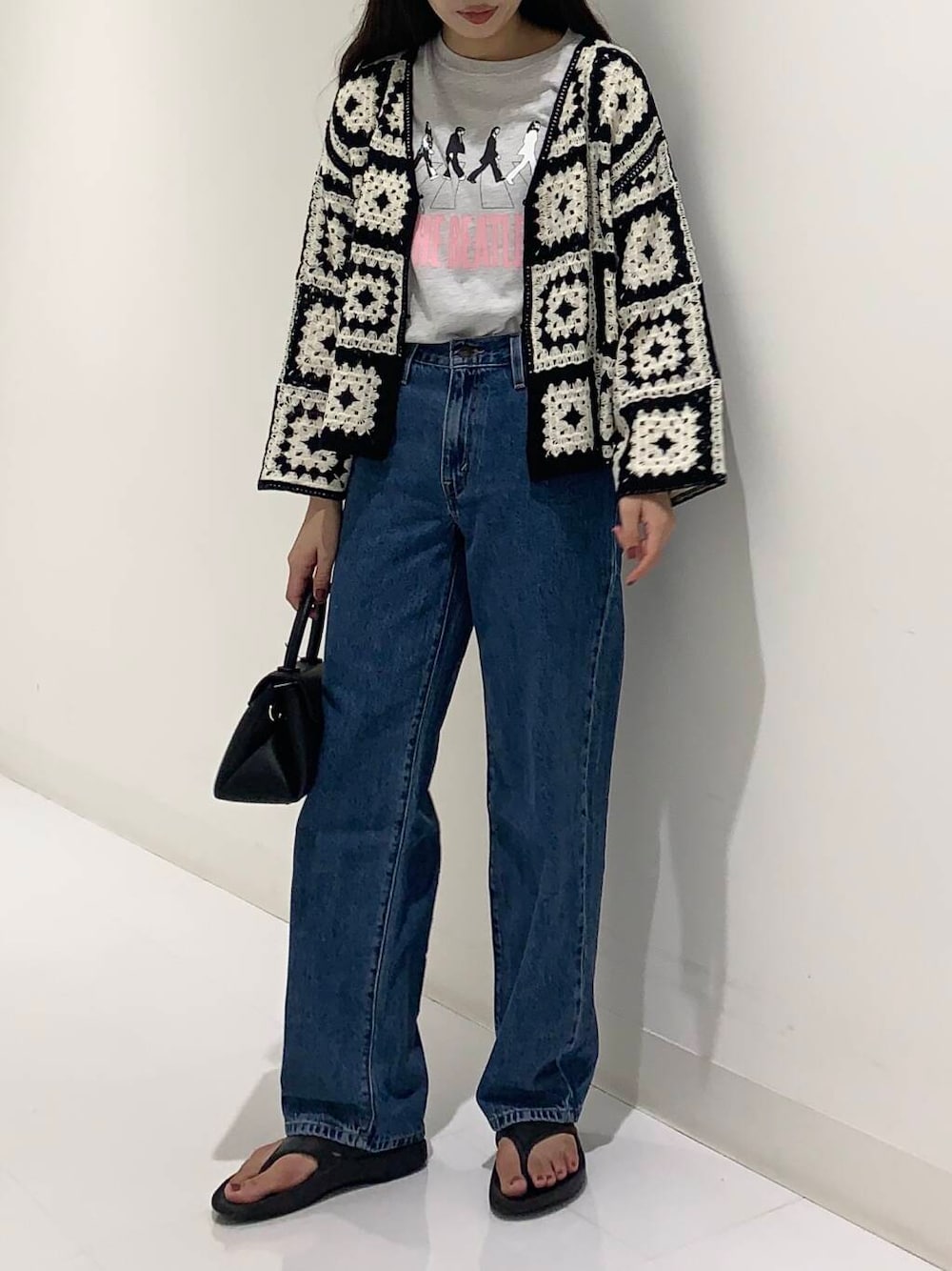 可愛い柄のカーディガンとデニムで大人カジュアルなお出かけコーディネートです^^ <パッチワーククロシェニットカーディガン> コーディネートのポイントになる柄のカーディガンは比較的薄手な生地感なので今の時期にも合わせやすいです。 腕回りも程よくゆとりがあるので肌寒くなってきた際には長袖アイテムも通しやすいと思います◎ 全体のサイズも程よくゆとりのあるサイズ感に思いました。 可愛いのでリアルに狙っています👀 <GOOD ROCK SPEED THE BEATLES T-SHIRTS 1> 大人カジュアルなプリントTシャツはゆったりめでしたがパンツにインもしやすいと思いました。 インもアウトもどちらも楽しめそうなTシャツです◎ <Levi’s BAGGY DAD> 着用サイズは26です。 サイズ感はちょうどよく少しゆとりのあるサイズに感じました。 ルーズに合せる場合はひとつサイズを上げてもいいかなと思いました◎ しっかりした生地のデニムですが座ったり立ったりなどの動きはしやすかったです! <センターステッチミニバッグ> 形が可愛くて手に取ってしまいました^^ 小さめのバッグですが必要最低限は入る印象です。 重さは私は重いと感じませんでした◎ ベーシックにBLACKを選びましたがコーディネートの差し色にORANGEもいいですね! ※サンダルは私物です ・・・・・・・・・・・・・・・・・・・・・・・・・・ コーディネートや商品についてご相談がございましたらお気軽にチャットにお声がけください😌💬 <button><a href="https://www.urban-research.jp/special/onlinestore_chat/" style="color:black">【チャット相談】</a></button> ・・・・・・・・・・・・・・・・・・・・・・・・・・