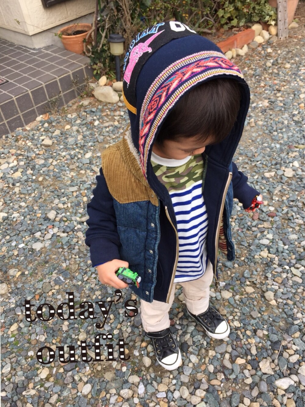 トーマスを両手に持ってばあばの 草むしりを眺めてます(o^^o) 数日前も似た様なコーデだったような…^_^;