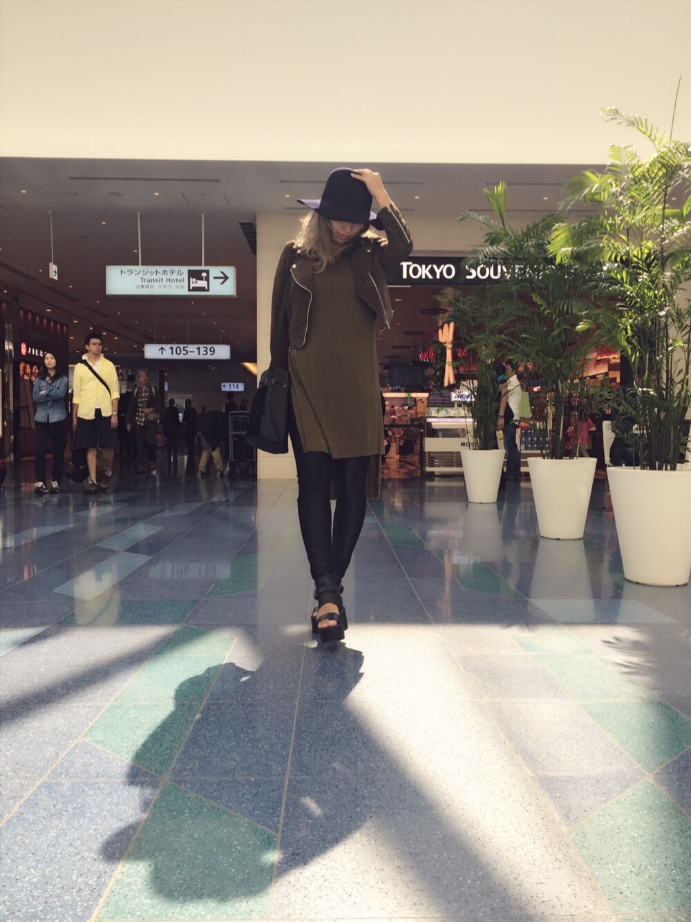 カーキのTシャツにカーキのライダース バッグは皮のフリンジのポシェット 帽子はつば広で 旅にも便利な形状記憶タイプ 夏に続き秋らしいボヘミアン調なスタイルも取り入れてみました