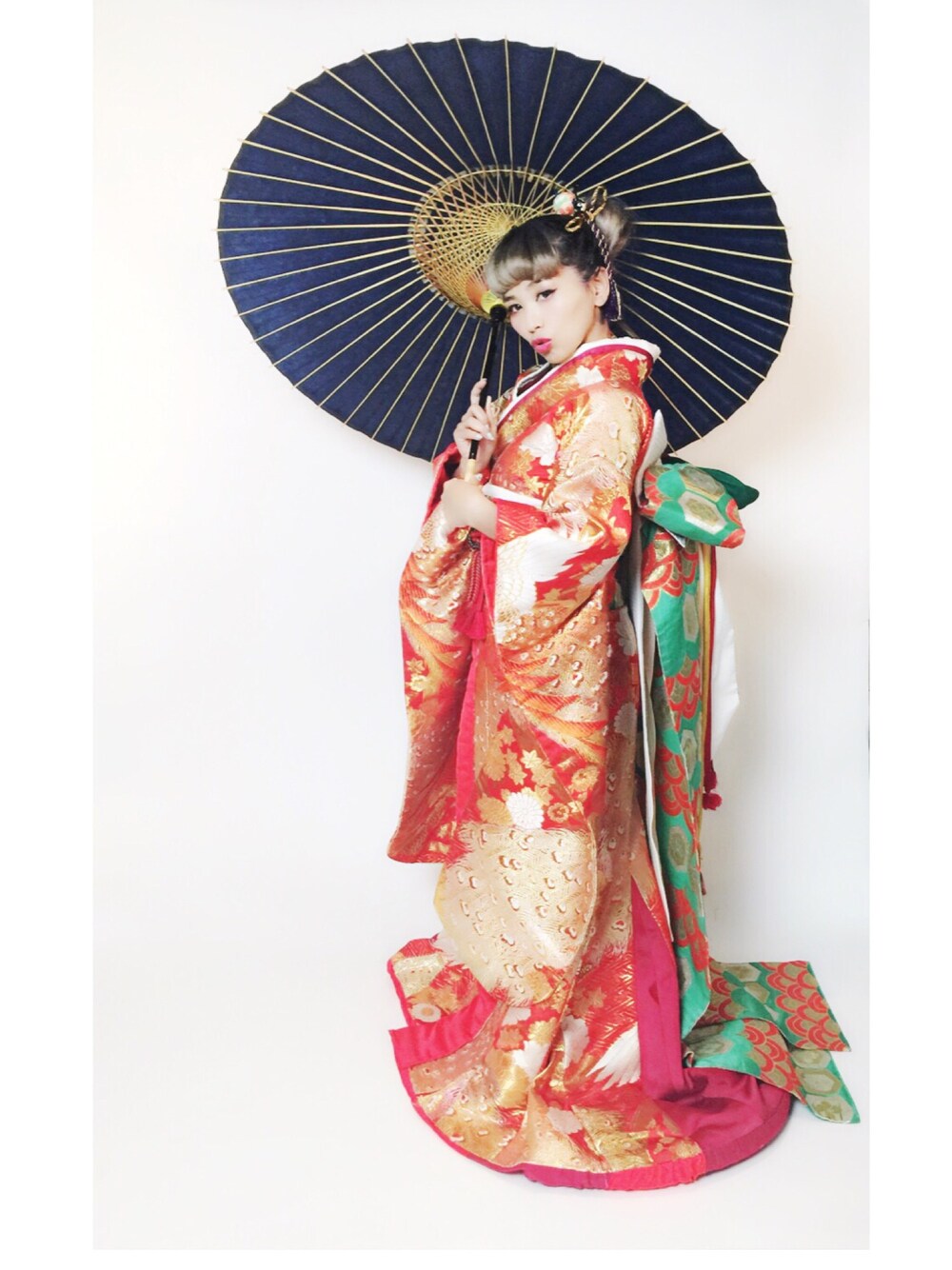 レッド系の浴衣を着用したレディースの冬コーディネートの1枚目の写真