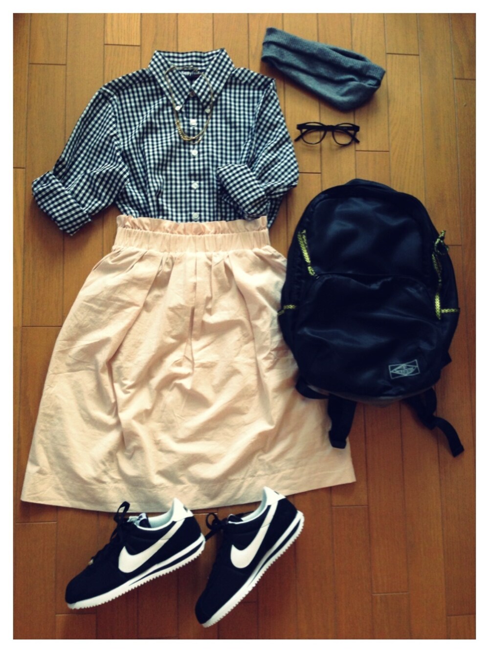 ターバン:nico and... チェックシャツ:flower(古着) スカート:mystic リュック:Another Edition 履きやすくてお気に入りのスカート&スニーカー☺︎ リュックを合わせて楽々ゆるゆる〜*