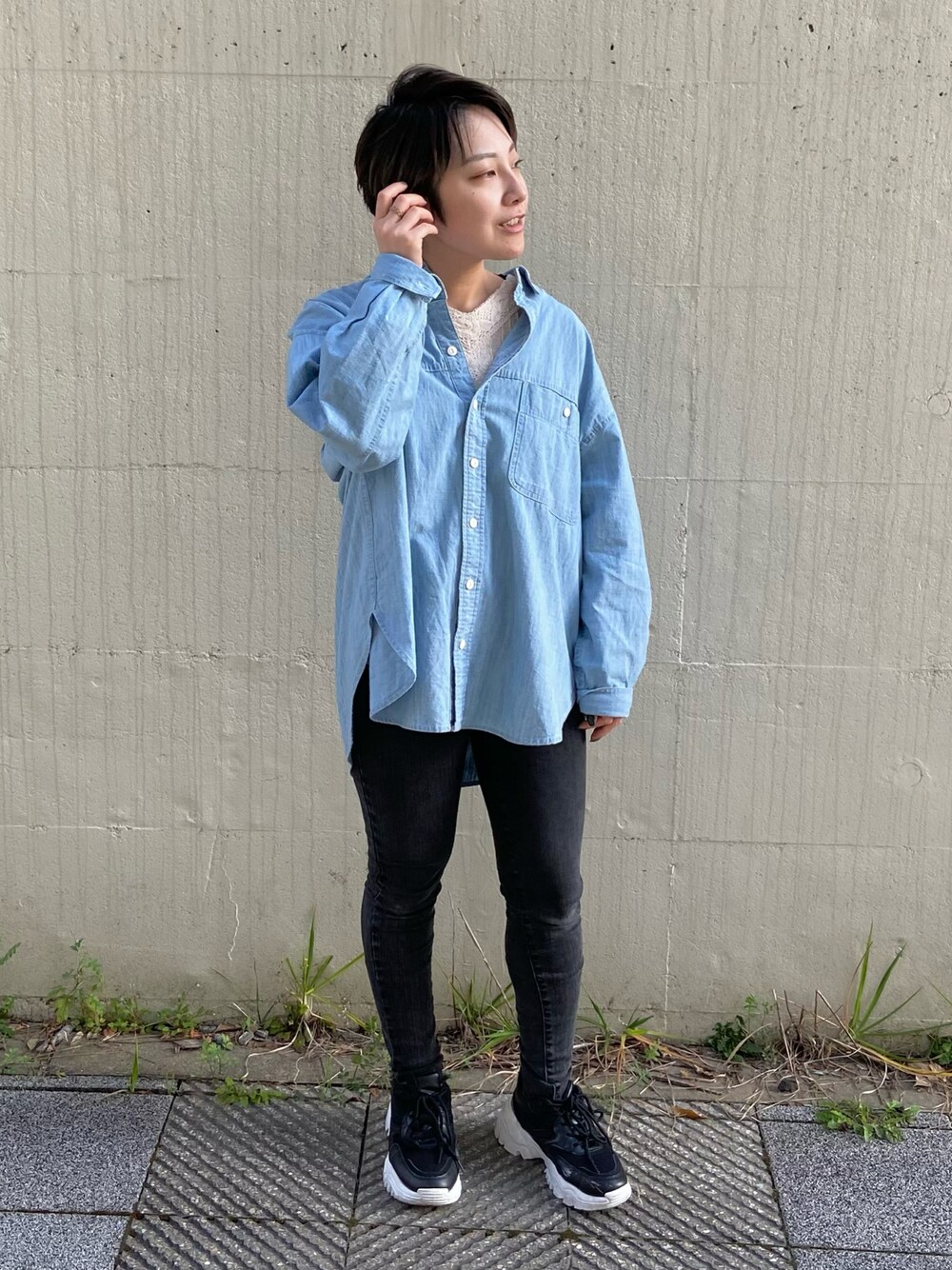 ご覧頂きありがとうございます。🙇♀️ 今回は デニムシャツチュニックを 使用したカジュアルゆるコーデです!🕊 スキニージーンズに オーバーサイズのトップス、 少し厚底のスニーカーをあわせました🤍 ●Vネックレースカットソー 何にでも合わせやすい、 襟がレースのカットソーです! カーディガンの中に合わせたり、 前ボタンのブラウスと相性が良いです◎ ●デニムシャツチュニック 春らしいお色味の デニムシャツチュニックです。 袖ボタンひとつ開けて、ひとつ折っています! 生地が少し厚手なのでこれから暖かくなったら 1枚でお出かけできます🌷 是非店頭やオンラインストアで ご確認ください🙇♀️