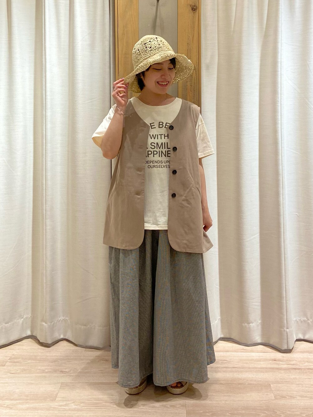 ご覧頂きありがとうございます。 今回は コットンリネンロングベストと 後ろ編み上げロゴプリントTシャツ を使用した夏コーデです◎ ベストはロング丈なので お尻まで隠れてすっきりとした ラインになります✿ 低身長でも着れる丈の ギャザーハカマパンツも 薄手なのでこれからの季節 涼しくておすすめです♬ 是非店頭やオンラインストアでご覧下さい!