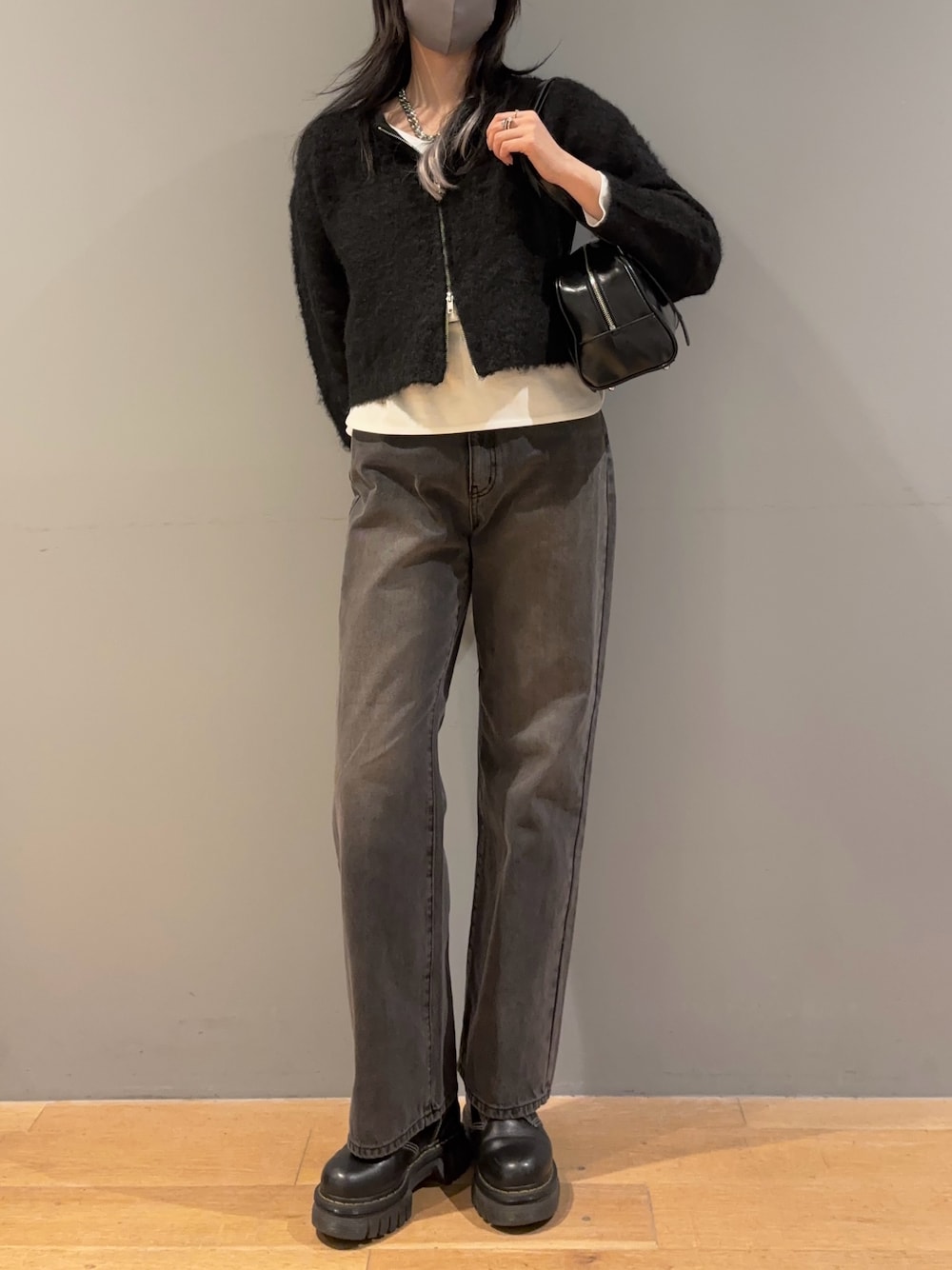 閲覧ありがとうございます🐈⬛ 168cm/骨格ストレート着用です⟡.· ✧ 𝐈𝐭𝐞𝐦𝐬 【tops】 size:F color:チャコールグレー ¥6490 さっと着るだけで、やさしく包み込まれるような着心地のモヘアタッチカーディガンです。 少しゆとりのあるシルエットとお尻まで隠れる丈感で、スタイルカバーしつつストレスフリーに着ていただけます❕ フロントの5つのボタンがアクセントになりつつ、ボタンを開けて羽織り、閉じてトップスとして両方で着れるデザインに。 袖口がリブ切り替えになっているので、メリハリをつけて着れるのも嬉しいポイント◎ ゆとりのあるシルエットなので、タートルネックやシャスなどに重ねてレイヤードスタイルもおすすめです。 【inner】 size:M color:ブラック ¥4950 程よい落ち感のあるドレープリブ素材を採用した、大人のためのハイネック長袖Tシャツです。 リブ特有の伸縮性により、自然なフィット感と快適な着心地抜群◎ 首元はやや高さを持たせたハイネック仕様になっているため、重ね着した際のレイヤードが美しく決まり、ジャケットやコートの中に着てもしっかりと存在感を発揮します。 顔まわりを引き締め知的な印象を与えるのもポイントです。 オンオフ問わず着回せる万能さと、素材・シルエットの上質さを兼ね備えたワードローブに1枚は持っておきたいアイテムになっています。 【bottoms】 size:M color:ブラックその他 ¥6820 COLONY2139を代表するワイドストレートデニム👖 昨年から今もなお人気な不動のブラックその他・韓国っぽさを演出してくれヴィンテージ感のあるブラック・昨年の春夏大好評で復活したサックスブルー・新色でオールシーズンで活躍するブルーの4色展開となります。 13ozと少し厚くなったためよりオールシーズンで使いやすくなり、デニム本来の質感が前回よりも感じやすくなっております。 ヒップと渡りを抑えめにし股上を深くとることで、ワイドながらも全体的にキレイめなシルエットになるように仕上げました。 腰回りもスッキリさせることでスタイルよく見せてくれます🫧 ストーンウォッシュ加工を施しキレイめながらもデニム特有の表情をお楽しみいただけます︎👍🏻⋆͛ 【bag】 size:F color:ブラック ¥5280 どんなコーディネートとも相性抜群のボストンバッグ👜 長財布やペットボトルも収納可能な容量です 床に置いても倒れない自立タイプで サッと手に取ってお出かけしやすいのも嬉しい♥️