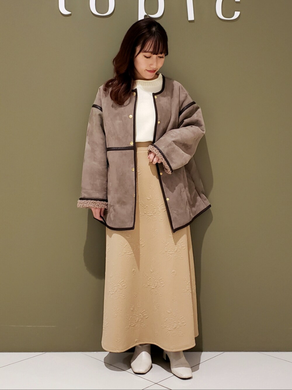 ・パイピングジャケット 袖が長めであれば、折っても裏がボアなのでおしゃれに調節ができて◎ ・ニット スカートにタックインしても腰回りが不自然な形にならないのが嬉しいデザインです。