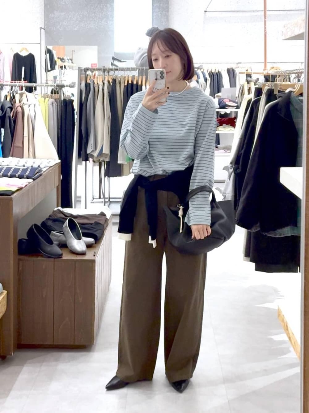 カジュアルなアイテムをきれいめに大人らしく👩🦱 【トップス】 ピッチの細かいボーダーカットソーはカジュアル過ぎずコーデのポイントにもおすすめ。着るだけで抜け感が出るサイズ感でシンプルながらもおしゃれ見え。 【ボトムス】 張り感があってシルエットのきれいなパンツは脚のラインを拾わず体型カバーにも🙆♀️ゆるっと履きたくてワンサイズ大きめをリアルバイしました(164センチ)
