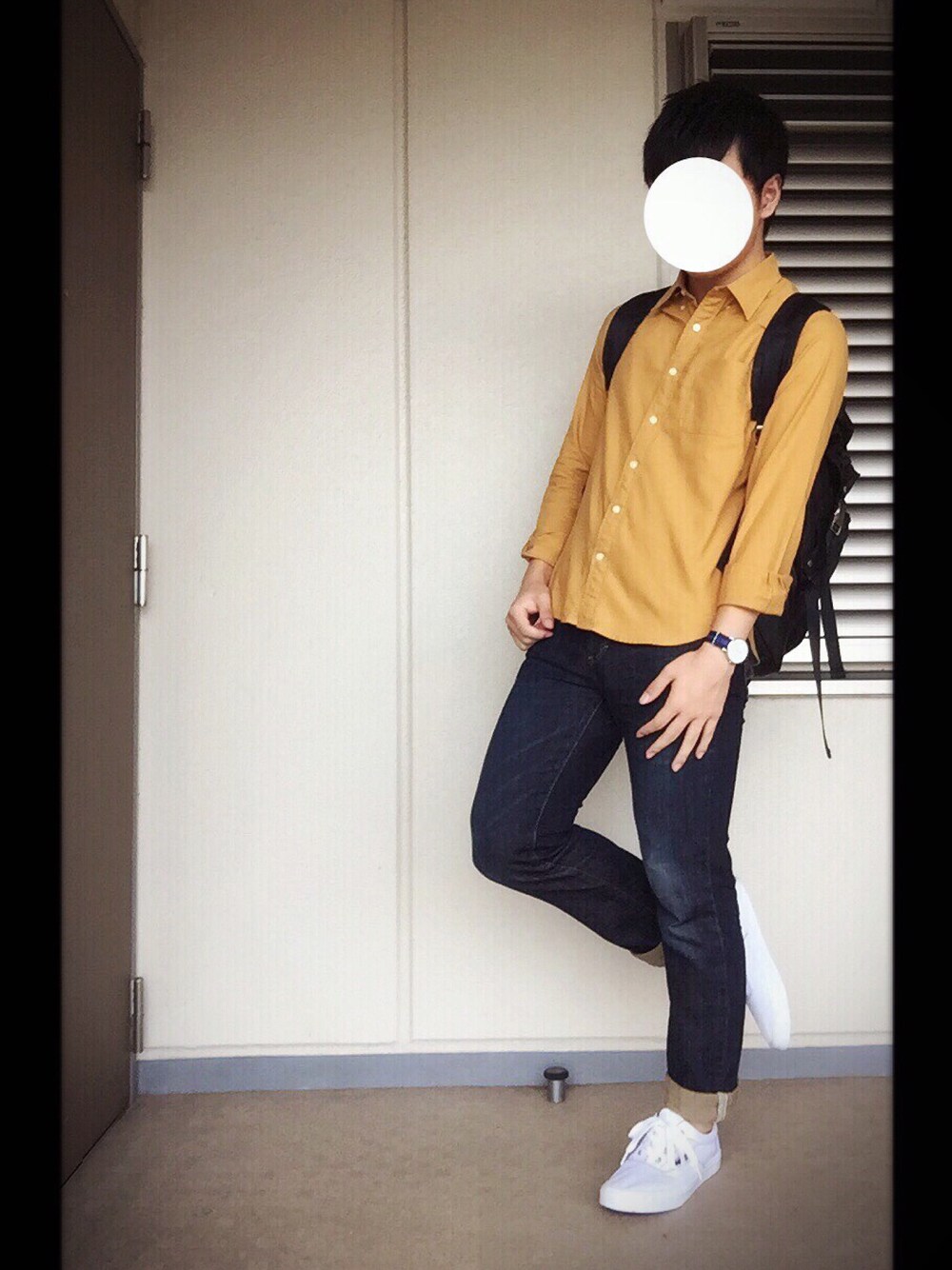塾コーデ 普通過ぎて...! からし色のシャツがメインになるようにしました。 首が太すぎて第1ボタンを無理やり閉めたらボタンの糸がはち切れましたヽ(;▽;)ノ