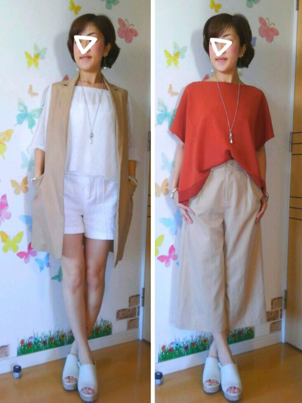 ご訪問、いいね♡、save、follow、コメント どうもありがとうございます‼🙌 とっても嬉しいです❤ 21℃/16℃ 晴れ 朝から晴れで清々しい天気の北国でした☀ 今週は良い天気が続くらしいです🙌 なんと、フォロワーひとみんから 「コーヒーカラーコーデバトン」が回ってきました🎵 コーヒーに含まれるクロロゲン酸に抗ガン作用があるので 1日に2〜3杯飲むと良いそうです☕ ですが… 大人なブラックコーヒーは苦手なワタクシ💦 もちろんそのままでは飲めません😢 お砂糖たっぷりにミルク少しなら美味しく頂けます☕ カフェラテ、カフェモカ アイスコーヒー(ガムシロ多め)は好きです❤ そんなブラックコーヒーが飲めない私 コーヒーカラーの茶色の服も殆ど所有してません😅 さて、困った…と思ったけど 土曜日、皆さんのコーデと雑誌を見ていいなと思った テラコッタ色のトップスをセールで格安に…👛(笑) そんな訳で 新しいアイテムを使って早速コーデを組んでみました🎵 右はテラコッタ色のトップスに ボトムスは昨年ヘビロテしたGUガウチョを合わせて 同系色コーデに✨ 足元に白サボを足して❤ 私にしては珍しく新しい配色コーデ⤴😲 キャラメルラテかマキアートっぽいかな?☕ そして左は白オフショルにベージュのロングベスト💡 このベスト、せっかく買ったのに着る時期を逃してしまい 登場回数少なめ💦 でも、こんなコーデなら今時期着れそう🎵 ボトムは白レースのショートパンツにして カフェモカかカフェラテっぽいイメージに❤ さて、どちらがお好みですか〜⁉ 投票&コメント頂けると、とても嬉しいです🎵 《つぶやき》 ・「ひとりサロペフェス」「ひとりマキシスカートフェス」は超ロングラン開催中です😆💕👍 ・コーヒーカラーバトン、私のフォロワーさん殆どバトン回ってたので、ここで一旦終了にします🙇もしもやってみたい!と言う方いらっしゃいましたら、ご自由に引き継いで下さ〜い🙋 ・新しい髪型、イマイチ上手く乾かせなくて今朝は左側がハネまくり💧何度直しても直らないのでこのまま撮りました😞いいセットの仕方見つけなきゃ🙋 いつも見て下さってありがとうございます☺