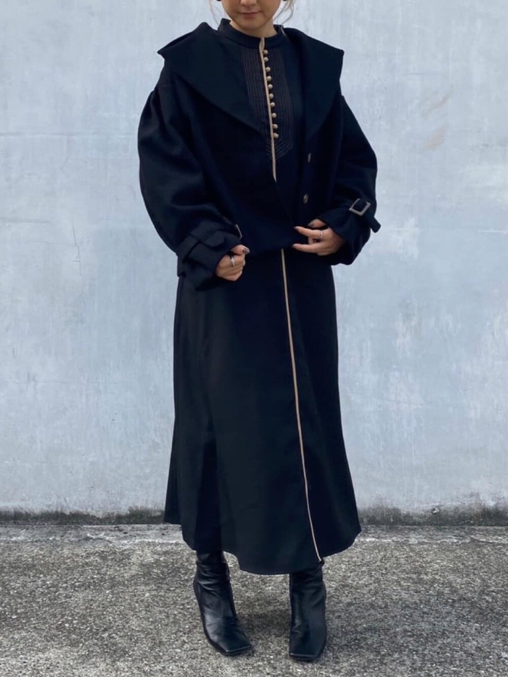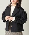 袖コンシャツがポイントのショートコートに黒ワンピースを合わせました。 コートは、袖や衿の形がとても可愛いし着丈がパンツでもワンピースでもどんなアイテムを合わせてもいいです。 ワンピースは、センターフロントの配色パイピングとボタンが細長く見えます。